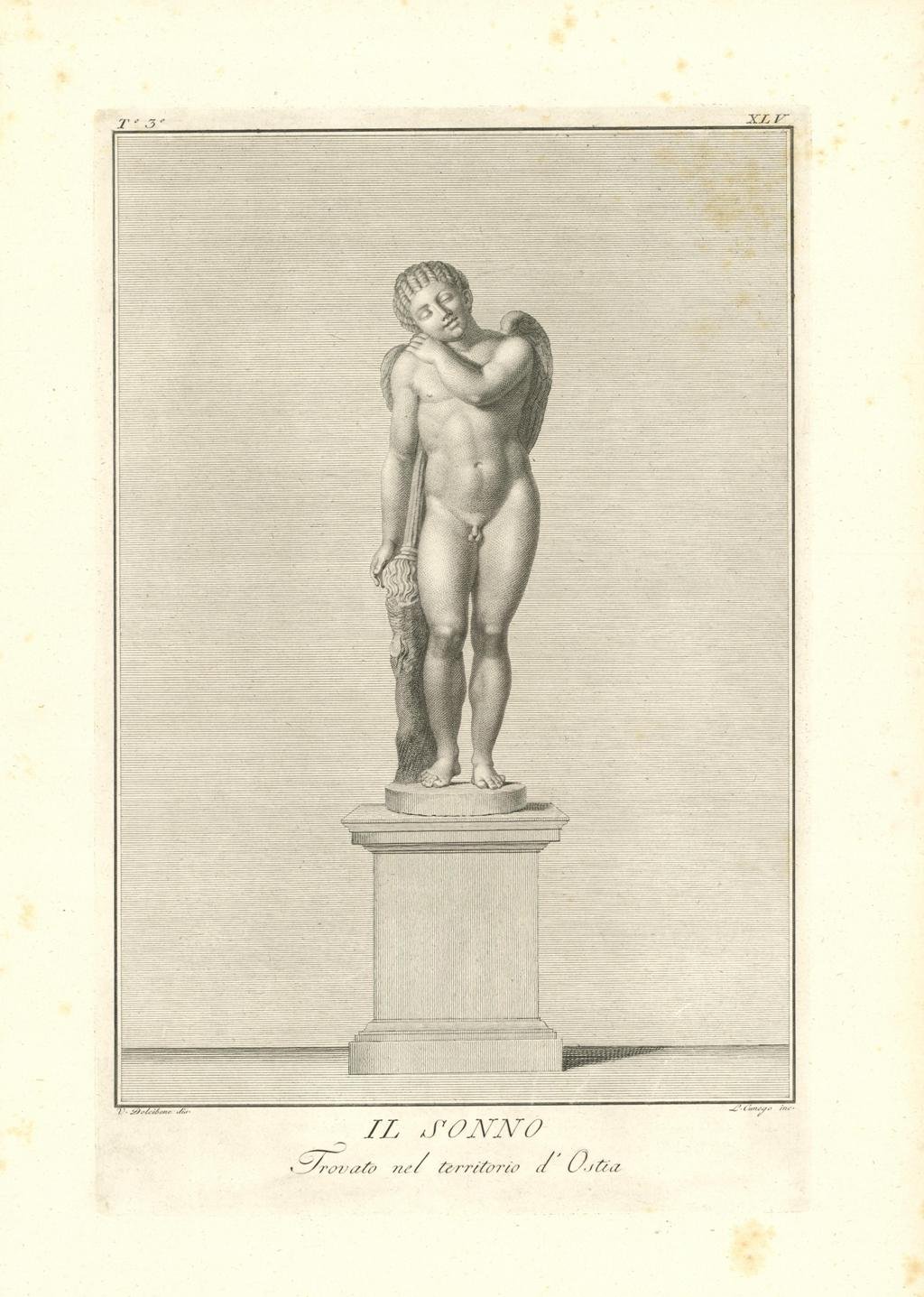 Questa graziosa statua, con sfondo inciso, rappresenta il dio del sonno, nella mitologia greca Hypnos, figlio della Notte e fratello gemello di Tanato. La statua alata dorme in piedi appoggiandosi ad un tronco con la mano destra, i suoi capelli sono acconciati in piccole trecce. La torcia rovesciata sulla destra simboleggia la morte, il sonno eterno, infatti tali sculture sono presenti nei sepolcri antichi. Inserita nell'opera "Il Museo Pio-Clementino descritto da Ennio Quirino Visconti - Tomo terzo - Dedicato alla Santità di Nostro Signore PIO SESTO Pontefice Massimo. Edito da Luigi Mirri / Mercante di quadri incontro il Palazzo Bernini. In Roma MDCCLXXXIV con Privilegio Pontificio. Leggero foxing