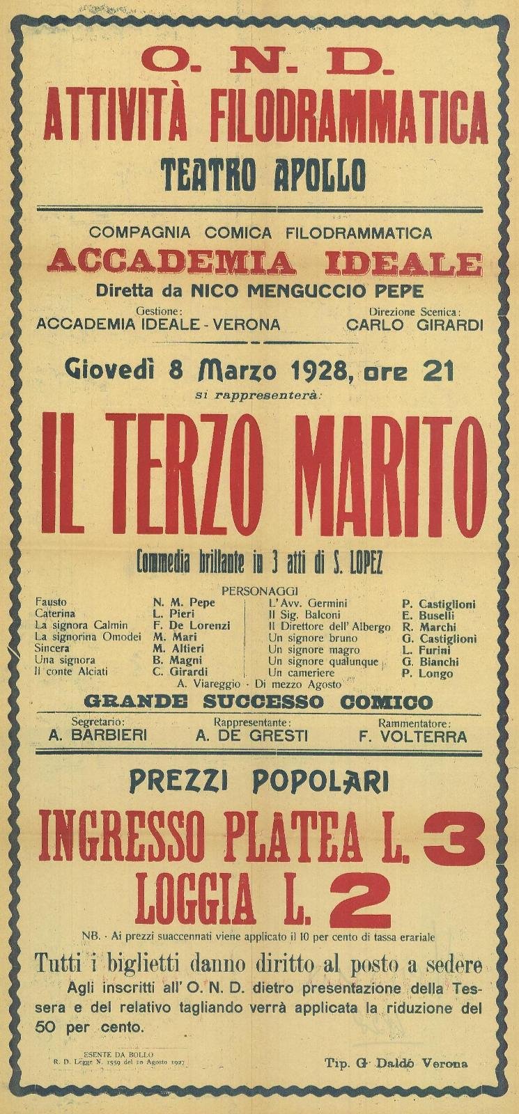 Commedia in tre atti di Sabatino Lopez, Compagnia Comica Filodrammatica Accademia Ideale, con Nico Pepe. Teatro Apollo. Tipografia G. Daldo - Verona. Locandina ripiega più volte, annotazione al retro