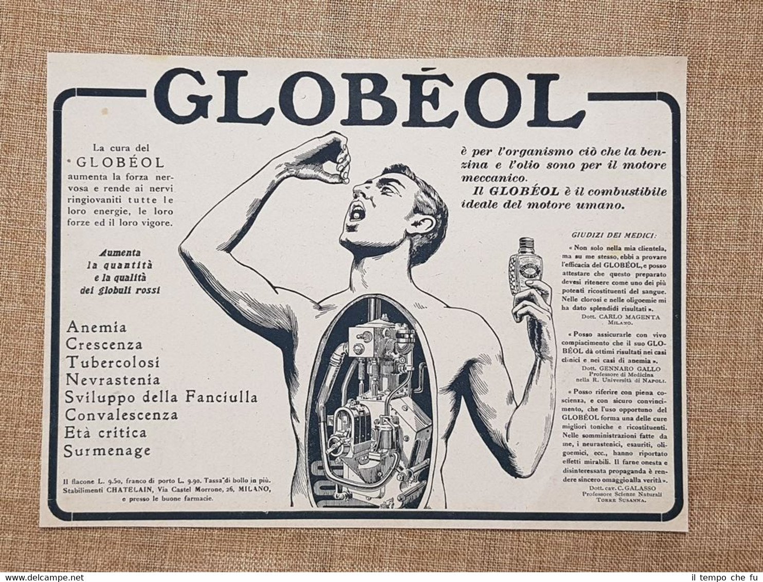 Il tonico vivificante Globeol Chatelain Milano Pubblicità del 1918 Rara stampa estratta da pubblicazione del 1918 Il tonico vivificante Globeol Chatelain Milano Pubblicità del 1918Dimensioni: Cm 25,00 x 19,00Codice prodotto: Pubblicità - 108
