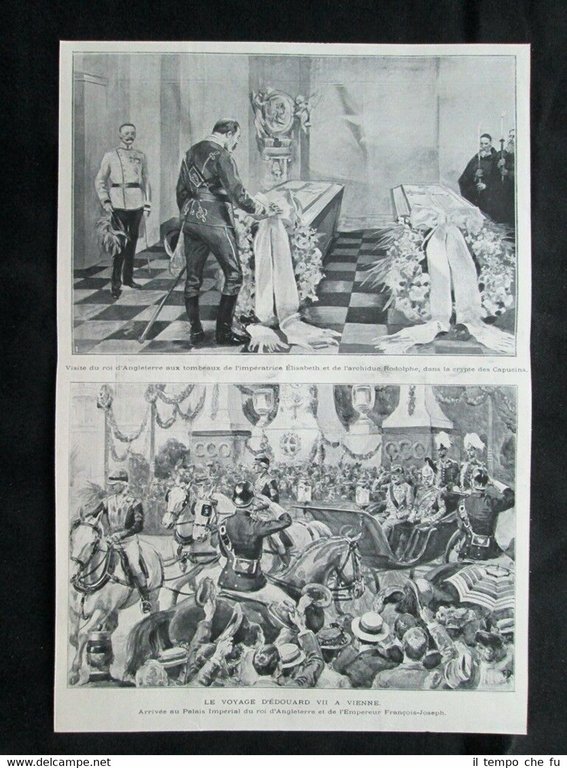 Rara stampa estratta da pubblicazione del 1903 .stampa che ha quindi oltre 115 anni! Il viaggio di Edoardo VII, Re d'Inghilterra, a Vienna Visita del Re d'Inghilterra alle tombe dell'imperatrice Elisabetta e dell'arciduca Rodolfo, nella Cripta dei Cappuccini Arrivo al Palazzo Imperiale del Re d'Inghilterra e dell'Imperatore Francesco Giuseppe Dimensioni Cm 23,00 x 34,00 Illustration 1903 - 023 Qualora vogliate delle scansioni migliori contattateci, soddisferemo ogni vostra richiesta. Paypal Carta di credito Bonifico bancario Accuratamente adagiate su un cartoncino e protette da pellicola trasparente rigida, il tutto viene inserito dentro plico di adeguate dimensioni per proteggerne l'integrità.