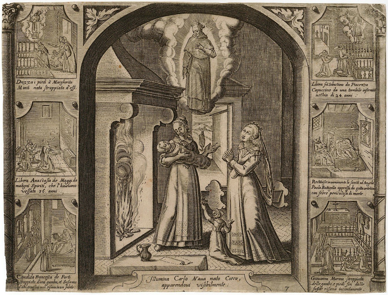Bella rappresentazione, antica ed originale, con al centro Il miracolo di Carlino Nava nato cieco, attorniata da sei vignette che rappresentano alcuni alcuni dei suoi miracoli. Inserita nell'opera "Vita e Miracoli di S. Carlo Borromeo". Dedicata a Sig. Ranuccio Farnese Duca di Parma. Edita a Roma nel 1610. Incisione nr 7 dell'opera. Mancanza dei margini