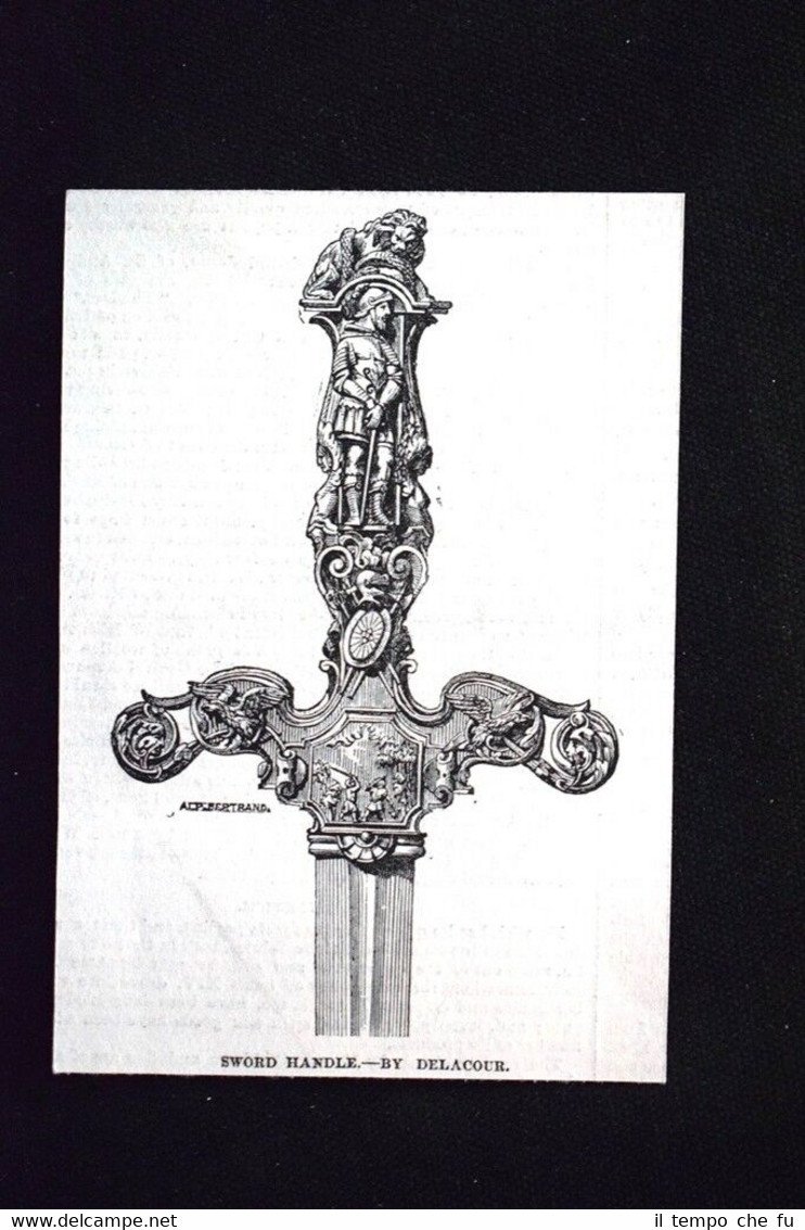 Rara incisione estratta da pubblicazione del 1851. .incisione che ha quindi oltre 167 anni! Impugnatura della spada, di Delacour Dimensioni Cm 8,00 x 11,00 ILN1851 - 35 Qualora vogliate delle scansioni migliori contattateci, soddisferemo ogni vostra richiesta. Paypal Carta di credito Bonifico bancario Accuratamente adagiate su un cartoncino e protette da pellicola trasparente rigida, il tutto viene inserito dentro plico di adeguate dimensioni per proteggerne l'integrità.