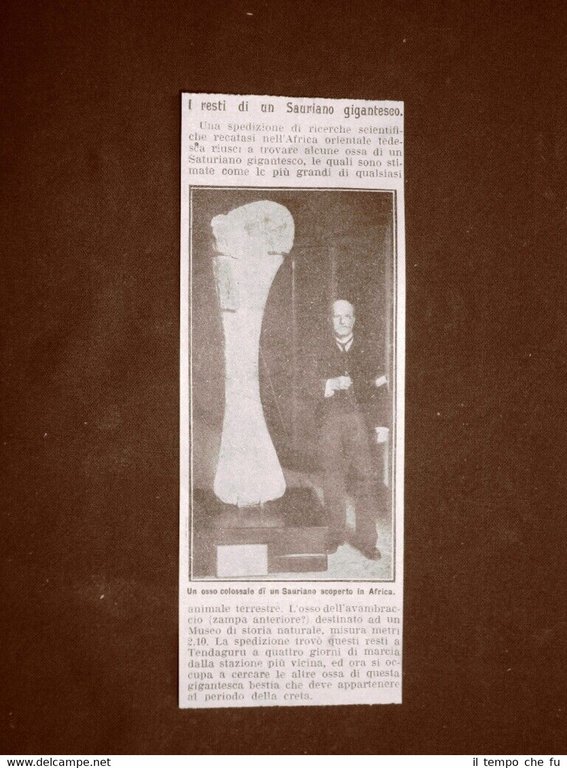 Rara stampa estratta da pubblicazione del 1910. .stampa che ha quindi oltre 109 anni! In Africa nel 1910 Scoperta di un osso colossale di un Sauriano II1910-065 Dimensioni Cm 6,00 x 16,00 Qualora vogliate delle scansioni migliori contattateci, soddisferemo ogni vostra richiesta. Paypal Carta di credito Bonifico bancario Spedizione con posta ordinaria o raccomandata scelta dall'acquirente nel momento del pagamento