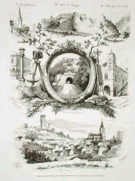 Insieme di vedute raffiguranti le varie località toccate dalla ferrovia: Osoppo, Venzone, Udine, Gemona . Testo al verso