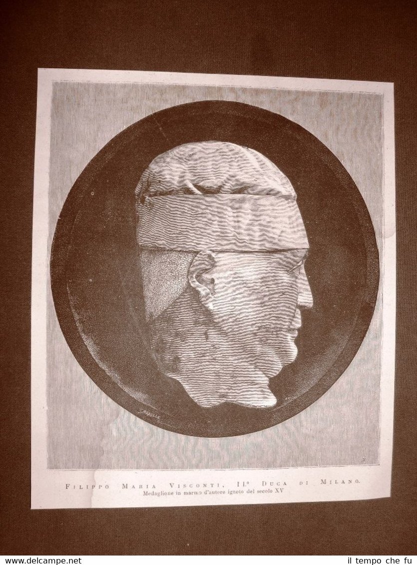 Incisione 1876 Filippo Maria Visconti II° Duca di Milano Medaglione del sec.XV°