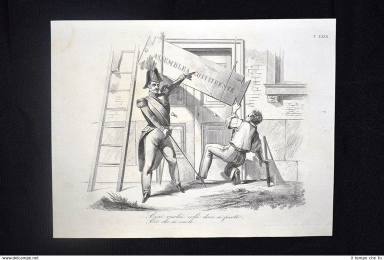 Preziosa ottocentina allegorico - caricaturale Tema: Il 5 dicembre 1848 viene sciolta l'Assemblea Costituente a Berlino, su ordine di Federico Guglielmo di Prussia Bella e rara incisione all'acquaforte di satira pungente e dissacrante sui Moti del 1848, detti anche Rivoluzione del '48 o Primavera dei Popoli, che sconvolsero l'Italia e tutta l'Europa nel 1848 e 1849. Estratta dall'introvabile: Don Pirlone a Roma. Memorie di un Italiano dal 1°settembre 1848 al 31 dicembre 1850. Autore: Michelangelo Pinto Editore: Alessandro Fontana Anno di pubblicazione: 1851 DON PIRLONE - 006/LXIX Dimensioni Cm 22,00 x 16,00 Qualora vogliate delle scansioni migliori contattateci, soddisferemo ogni vostra richiesta. Contesto storico: I moti del 1848, detti anche rivoluzione del '48 o Primavera dei popoli furono un'ondata di moti rivoluzionari borghesi che sconvolsero l'Europa nel 1848 e nel 1849. Scopo dei moti fu abbattere i governi della Restaurazione per sostituirli con governi liberali. Il loro impatto storico fu così profondo e violento che nel linguaggio corrente è entrata in uso l'espressione «fare un quarantotto» per sottintendere una improvvisa confusione e scompiglio. La prima agitazione europea del 1848 si verificò in Italia: la rivoluzione siciliana che esplose il 12 gennaio di quell'anno, che rappresentò la prima miccia dell'esplosione europea. L'insurrezione siciliana, infatti, spinse in un primo momento i Borbone a concedere il ritorno nell'Isola alla costituzione del 1812. Seguì una rivoluzione a Napoli, il 27, che costrinse, due giorni dopo, Ferdinando II a promettere una Costituzione, promulgata l'11 febbraio. Lo stesso 11 febbraio Leopoldo II di Toscana, cugino primo dell'imperatore Ferdinando I d'Austria, concesse la Costituzione, nella generale approvazione dei suoi sudditi. L'esempio borbonico fu seguito da Carlo Alberto di Savoia con lo Statuto Albertino e da Papa Pio IX con lo Statuto Fondamentale. Solo il re piemontese mantenne però lo Statuto. In Sicilia il parlamento proclamò in marzo l'indipendenza, che sarebbe durata fino al maggio 1849. Nel napoletano la concessione e la successiva repressione delle libertà costituzionali, portò dal maggio al settembre di quell'anno a una serie di moti. In tutto il Regno Lombardo-Veneto scoppiarono rivolte, come le Cinque giornate di Milano che sfociarono nella prima guerra di indipendenza. Nello Stato Pontificio una rivolta interna estromise papa Pio IX dai suoi poteri temporali e portò alla costituzione della Repubblica Romana. La rivoluzione delle Cinque giornate di Milano e altre proteste indussero il Re Carlo Alberto a dichiarare guerra all'Austria. Le truppe vennero presto sconfitte e solo quelle francesi poterono far retrocedere gli austriaci. La successiva ascesa al trono di Vittorio Emanuele II fece del Piemonte il motore propulsore del processo di unificazione italiana che tuttavia si sarebbe ottenuto solo nel 1861. Per quanto i Moti del '48 furono sedati abbastanza velocemente, le vittime furono decine di migliaia: il destino della democrazia europea ci è sfuggito di mano dichiarerà Pierre-Joseph Proudhon. Gli storici concordano che la Primavera dei popoli fu, alla fin fine, soprattutto un sanguinoso fallimento, se si eccettua la concessione dello Statuto Albertino nel Regno di Sardegna da parte di Carlo Alberto di Savoia, l'unica costituzione non revocata di quelle concesse o votate nel 1848-49. Vi furono tuttavia radicali e notevoli effetti a lungo termine: Germania e Italia sarebbero presto arrivate all'unificazione facendo leva anche sulla necessità di autodeterminazione dei popoli. Analogamente l'Ungheria sarebbe giunta ad un parziale riconoscimento della propria autonomia (a discapito della popolazione slava) grazie all'Ausgleich del 1867. In Prussia e Austria fu abolito il feudalesimo, mentre in Russia fu eliminata la servitù della gleba nel 1861. Tavola allegorico - caricaturale sullo stato dell'Italia del tempo, incisione su rame ricca di significato e rappresentazione mediante satirica dissacrante della condizione della nostra penisola oppressa. Le tavole dell'opera furono in parte riprese dal giornale romano Don Pirlone, quotidiano, uscito dal 1 settembre 1848 al 2 luglio 1849 (con una interruzione dl 29 aprile al 7 maggio 1849), ma in parte furono realizzate appositamente per questa opera. Tra gli incisori sono presenti anche i nomi di Ratti, Vaiani, Monneret, Gallucci, Pichi, Masutti. Il titolo Don Pirlone deriva quasi sicuramente da una maschera creata dallo scrittore satirico Girolamo Gigli (1660 - 1722). Si trattava di una specie di Tartufo molieresco, ispirato ad una figura reale, il canonico Feliciati di Sarteano. Nei tre volumi l'avvocato Michelangiolo Pinto raccolse tutto il pubblicato del giornale, che fu il più temuto e allo stesso tempo il più apprezzato tra i molteplici giornali satirici che si pubblicavano nella Roma di Pio IX all'epoca delle grandi riforme volute dal Papa. I romani gli dedicarono perfino una canzone (Davanti