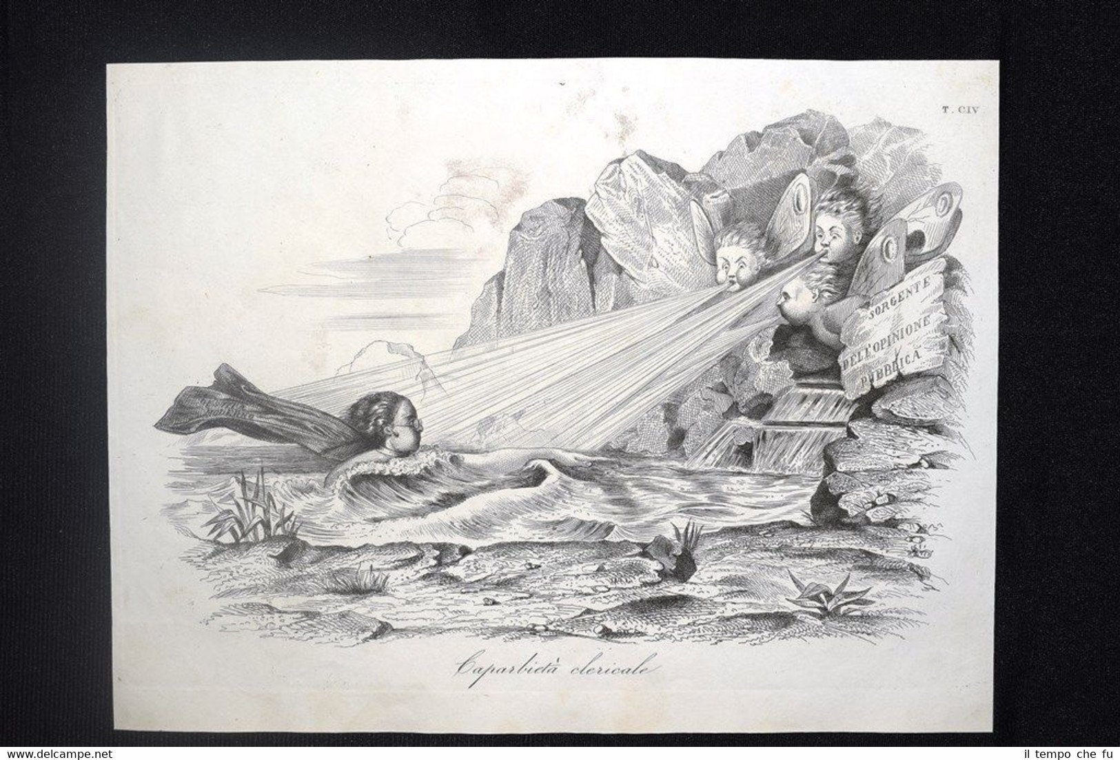 Preziosa ottocentina allegorico - caricaturale Tema: La caparbietà clericale di Vincenzo Gioberti non lo fa arrendere alle avversioni dei colleghi politici e al disprezzo dell'opinione pubblica: contro il suffraggio dei deputati, contro l'interesse e il decoro della nazione, Gioberti tenta di risalire la corrente. Ma il Re di Sardegna Carlo Alberto rispetta il voto del popolo, dimostrando maggior saggezza di chi avrebbe dovuta averla per lui Bella e rara incisione all'acquaforte di satira pungente e dissacrante sui Moti del 1848, detti anche Rivoluzione del '48 o Primavera dei Popoli, che sconvolsero l'Italia e tutta l'Europa nel 1848 e 1849. Estratta dall'introvabile: Don Pirlone a Roma. Memorie di un Italiano dal 1°settembre 1848 al 31 dicembre 1850. Autore: Michelangelo Pinto Editore: Alessandro Fontana Anno di pubblicazione: 1851 DON PIRLONE - 009/CIV Dimensioni Cm 22,00 x 16,00 Qualora vogliate delle scansioni migliori contattateci, soddisferemo ogni vostra richiesta. Contesto storico: I moti del 1848, detti anche rivoluzione del '48 o Primavera dei popoli furono un'ondata di moti rivoluzionari borghesi che sconvolsero l'Europa nel 1848 e nel 1849. Scopo dei moti fu abbattere i governi della Restaurazione per sostituirli con governi liberali. Il loro impatto storico fu così profondo e violento che nel linguaggio corrente è entrata in uso l'espressione «fare un quarantotto» per sottintendere una improvvisa confusione e scompiglio. La prima agitazione europea del 1848 si verificò in Italia: la rivoluzione siciliana che esplose il 12 gennaio di quell'anno, che rappresentò la prima miccia dell'esplosione europea. L'insurrezione siciliana, infatti, spinse in un primo momento i Borbone a concedere il ritorno nell'Isola alla costituzione del 1812. Seguì una rivoluzione a Napoli, il 27, che costrinse, due giorni dopo, Ferdinando II a promettere una Costituzione, promulgata l'11 febbraio. Lo stesso 11 febbraio Leopoldo II di Toscana, cugino primo dell'imperatore Ferdinando I d'Austria, concesse la Costituzione, nella generale approvazione dei suoi sudditi. L'esempio borbonico fu seguito da Carlo Alberto di Savoia con lo Statuto Albertino e da Papa Pio IX con lo Statuto Fondamentale. Solo il re piemontese mantenne però lo Statuto. In Sicilia il parlamento proclamò in marzo l'indipendenza, che sarebbe durata fino al maggio 1849. Nel napoletano la concessione e la successiva repressione delle libertà costituzionali, portò dal maggio al settembre di quell'anno a una serie di moti. In tutto il Regno Lombardo-Veneto scoppiarono rivolte, come le Cinque giornate di Milano che sfociarono nella prima guerra di indipendenza. Nello Stato Pontificio una rivolta interna estromise papa Pio IX dai suoi poteri temporali e portò alla costituzione della Repubblica Romana. La rivoluzione delle Cinque giornate di Milano e altre proteste indussero il Re Carlo Alberto a dichiarare guerra all'Austria. Le truppe vennero presto sconfitte e solo quelle francesi poterono far retrocedere gli austriaci. La successiva ascesa al trono di Vittorio Emanuele II fece del Piemonte il motore propulsore del processo di unificazione italiana che tuttavia si sarebbe ottenuto solo nel 1861. Per quanto i Moti del '48 furono sedati abbastanza velocemente, le vittime furono decine di migliaia: il destino della democrazia europea ci è sfuggito di mano dichiarerà Pierre-Joseph Proudhon. Gli storici concordano che la Primavera dei popoli fu, alla fin fine, soprattutto un sanguinoso fallimento, se si eccettua la concessione dello Statuto Albertino nel Regno di Sardegna da parte di Carlo Alberto di Savoia, l'unica costituzione non revocata di quelle concesse o votate nel 1848-49. Vi furono tuttavia radicali e notevoli effetti a lungo termine: Germania e Italia sarebbero presto arrivate all'unificazione facendo leva anche sulla necessità di autodeterminazione dei popoli. Analogamente l'Ungheria sarebbe giunta ad un parziale riconoscimento della propria autonomia (a discapito della popolazione slava) grazie all'Ausgleich del 1867. In Prussia e Austria fu abolito il feudalesimo, mentre in Russia fu eliminata la servitù della gleba nel 1861. Tavola allegorico - caricaturale sullo stato dell'Italia del tempo, incisione su rame ricca di significato e rappresentazione mediante satirica dissacrante della condizione della nostra penisola oppressa. Le tavole dell'opera furono in parte riprese dal giornale romano Don Pirlone, quotidiano, uscito dal 1 settembre 1848 al 2 luglio 1849 (con una interruzione dl 29 aprile al 7 maggio 1849), ma in parte furono realizzate appositamente per questa opera. Tra gli incisori sono presenti anche i nomi di Ratti, Vaiani, Monneret, Gallucci, Pichi, Masutti. Il titolo Don Pirlone deriva quasi sicuramente da una maschera creata dallo scrittore satirico Girolamo Gigli (1660 - 1722). Si trattava di una specie di Tartufo molieresco, ispirato ad una figura reale, il canonico Feliciati di Sarteano. Nei tre volumi l'avvocato Michelangiolo Pint