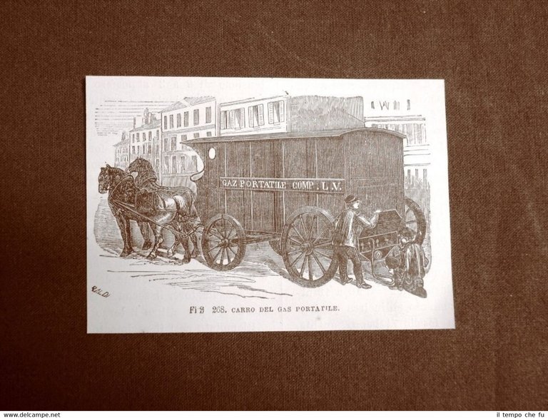 Incisione del 1875 Invenzione Il carro del gas portatile