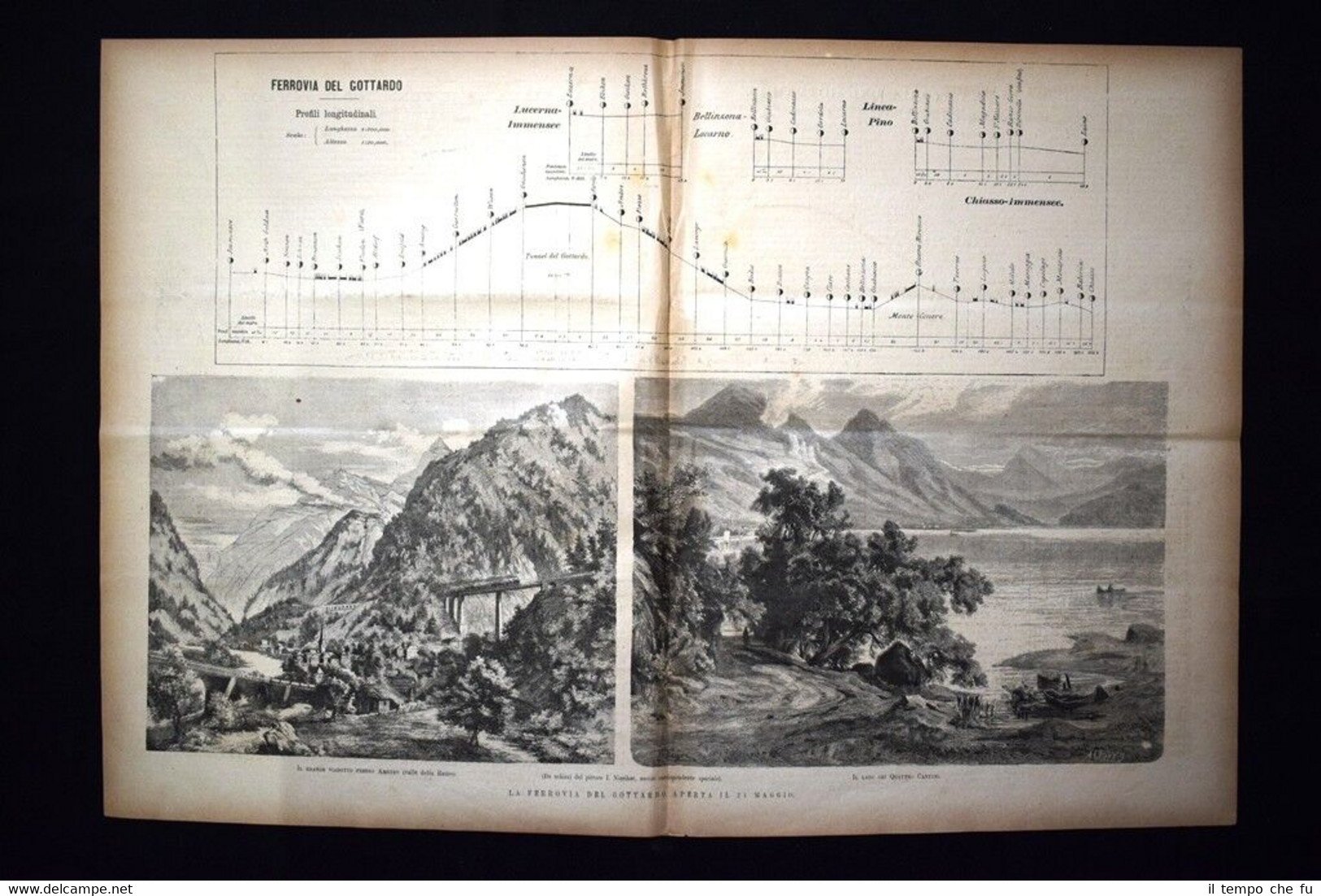 Rara incisione estratta da pubblicazione del 1882. .incisione che ha quindi oltre 136 anni! INCISIONE ENORME! La Ferrovia del Gottardo, aperta il 21 maggio 1882 Profili longitudinali della ferrovia Il grande viadotto presso Amsteg (Valle della Reuss) Il Lago dei Quattro Cantoni Dimensioni Cm 53,00 x 36,00 EP1882 - 080 Qualora vogliate delle scansioni migliori contattateci, soddisferemo ogni vostra richiesta. Paypal Carta di credito Bonifico bancario Accuratamente adagiate su un cartoncino e protette da pellicola trasparente rigida, il tutto viene inserito dentro plico di adeguate dimensioni per proteggerne l'integrità.