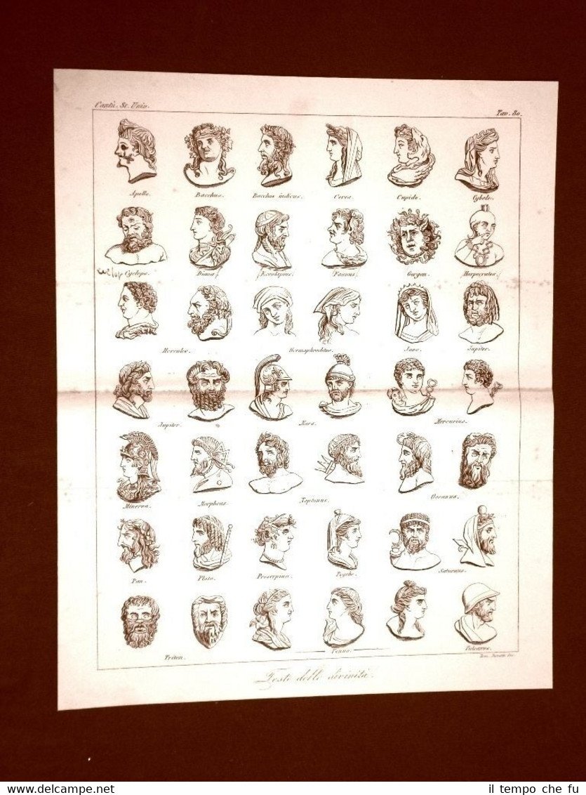 Incisione in rame del 1846 Teste di Dei di Grecia Domenico Bonatti Cesare Cantù