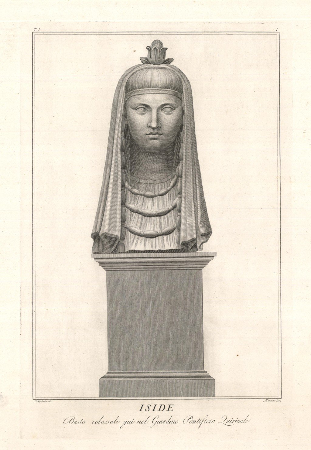 Incisione raffigurante Iside, inserita nel tomo primo dell'opera "Il Museo Chiaramonti aggiunto al Pio-Clementino da N. S. Pio VII P. N." Pubblicata da Antonio d'Este e Gaspare Capparone a Roma nel 1808. Il busto della divinità egizia mostra uno sguardo fiero. La dea indossa un panno che le vela il capo bendato, sulla sommità un fiore di loto impreziosisce il tutto; monili al collo e ai lati del volto fregiano la divinità dell'antico Egitto. Autore: Agricola L. dis & Marchetti inc. Luogo: Iside. Anno: 1808. Tecnica: incisione in rame. Dimensioni: 620x430 il foglio.