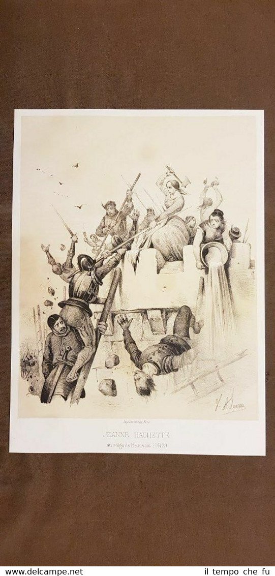 Rara incisione del 1859. Stampata su carta non retroscritta .Incisione che ha quindi oltre 161 anni! Jeanne Laisné o Jeanne Fourquet (1454 ? – .) E' stata un'eroina francese, conosciuta soprattutto con il soprannome di Jeanne Hachette, nota per le sue azioni durante l'assedio di Beauvais del 1472. Il 27 giugno 1472, Carlo il Temerario strinse d'assedio Beauvais, difesa solo da una piccola guarnigione comandata da Louis de Balagny e dai suoi stessi abitanti. Ad un certo punto dell'assedio, uno dei soldati borgognoni salì su una delle scale d'assedio per piantare la bandiera del proprio schieramento sulle mura della città, ma fu fermato da una giovane donna armata di accetta (hachette in francese), che uccise il soldato e si impossessò della bandiera. Il gesto di Jeanne, da quel momento soprannominata Hachette, diede nuovo coraggio agli abitanti della città, che continuarono a resistere fino al 22 luglio, quando Carlo di Borgogna rinunciò all'assedio e si ritirò. Re Luigi XI premiò la città di Beauvais, e Jeanne Hachette in particolare, per l'eroica resistenza, esonerando lei e i suoi discendenti dal pagamento delle tasse e sposandola con il suo fidanzato Colin Pilon. Istituì inoltre nella città di Beauvais una processione, tenuta ogni anno verso la fine di giugno, chiamata processione dell'assalto, durante la quale le donne sfilano davanti agli uomini. Codice articolo: VIP-041 Dimensioni: Cm 21,00 x 29,00 Estratta dalla "Galerie V. Adam" per la pregiata e rara opera "Universite de France - Atlas Universel Historique et Géographique", edita in Parigi nel 1859 da A. Houzé, membro della Società di geografia. Paypal Carta di credito Bonifico bancario Spedizione con posta ordinaria o raccomandata scelta dall'Acquirente nel momento del pagamento Clicca qui per accedere al nostro Store ed al suo sterminato archivio