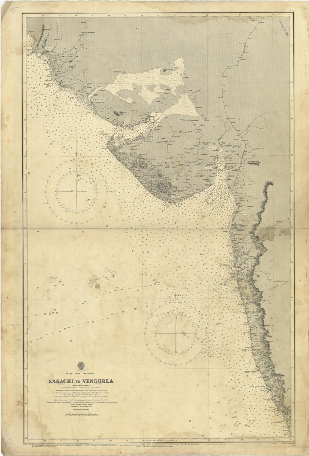 Karachi to Vengurla Compiled from the Surveys of Commanders R. Ethersey, A. Grieve, W.B. Selby & C.G. Constable. Lieutenants A.D. Taylor, C.Y. Ward, A.W. Stiffe & R. Williams, 1835 to 1862. under the direction of Commander A.D. Taylor, late Superintendent of the Marine Survey of India, by R.C. Carrington, Superintendent Drawing Branch, Calcutta. London Published at the Admiralty 15th Feb. 1877, under the Superintendence of Captain F.J. Evans, Hydrographer. Small corrections: 1931. Editorially folded. Autore: Admiralty Charts. Luogo: India occidentale. Anno: '900. Dimensioni: 974x618 mm