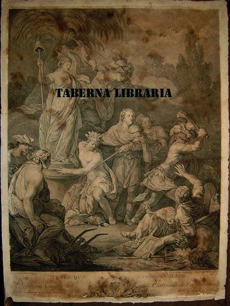 Acquaforte orig. cm. 50x37. Da un'opera di Antoine Borel (1747-1810). L'incisione esprime il sostegno francese alla rivoluzione americana e rende particolare omaggio a Benjamin Franklin, che godeva di grande rispetto, popolarit‡ e affetto negli ambienti ufficiali di tutta la Francia. Scena allegorica raffigurante Franklin al centro che indica una donna che indossa un elaborato copricapo e una tartaruga sotto i suoi piedi. Sopra un piedistallo una donna vestita di drappi si appoggia a un palo con il berretto della libert‡. Dietro di lei c'Ë un'altra donna con una lancia, uno scudo e un'armatura pronti a colpire un guerriero a petto nudo che sta per uccidere un uomo caduto che tiene in mano una catena. Nettuno, con tridente e la corona, Ë in acqua. A sinistra Hermes e molte altre figure fanno da spettatori. Uniformemente arrossata, qualche lievissima e piccola brasione al marg. inf. contenete cartiglio e titolo.