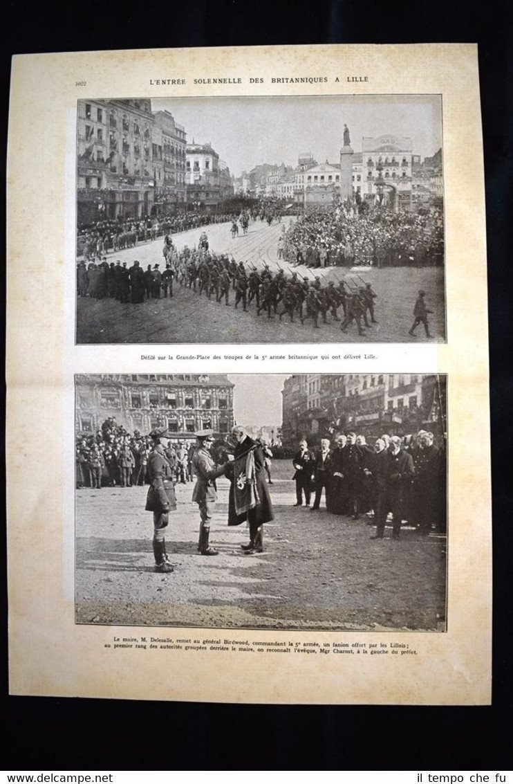 Rara stampa Estratta da pubblicazione del 1922 sulla Prima Guerra Mondiale del 1914-1918. .stampa che ha quindi oltre 95 anni! Rare print Extracted from publication of 1922 about the First World War of 1914 -1918. . press that has so over 95 years! Impression rare Extrait de la publication de 1922 sur la Première Guerre mondiale 1914-1918 . . press qui a tellement plus de 95 ans! Seltene druck Gewonnen aus der Veröffentlichung von 1922 auf dem Ersten Weltkrieg 1914-1918 . . Drücken, die so über 95 Jahren! L'entrée solennelle des Britanniques a Lille Défilé sur la Grande-Place des troupes de la 5° Armée britannique qui ont délivré Lille. Le maire, M. Delesalle, remet au général Birdwood, commandant la 5° armée, un fanion offert par les Lillois au premier rang des autorités groupées derrière le maire, on reconnait l'éveque, Mgr Charost, à la gauche du préfet Dimensioni Cm 29,00 x 39,00 ADLG - 027 Qualora vogliate delle scansioni migliori contattateci, soddisferemo ogni vostra richiesta. PaypalCarta di creditoBonifico bancario La stampa verrà inserita all'interno di plico di adeguate dimensioni per proteggerne l'integrità