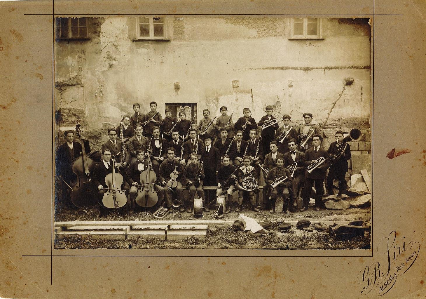 Bellissima fotografia della Banda musicale di Albenga? del fotografo G. B. Siri (Albenga Porta Arossia) applicata su cartoncino coevo di mm 230x330. Al retro con scritta calligrafica "Ricordo di Famiglia - Albenga giugno 1918". Piega nel cartoncino in basso a sinistra