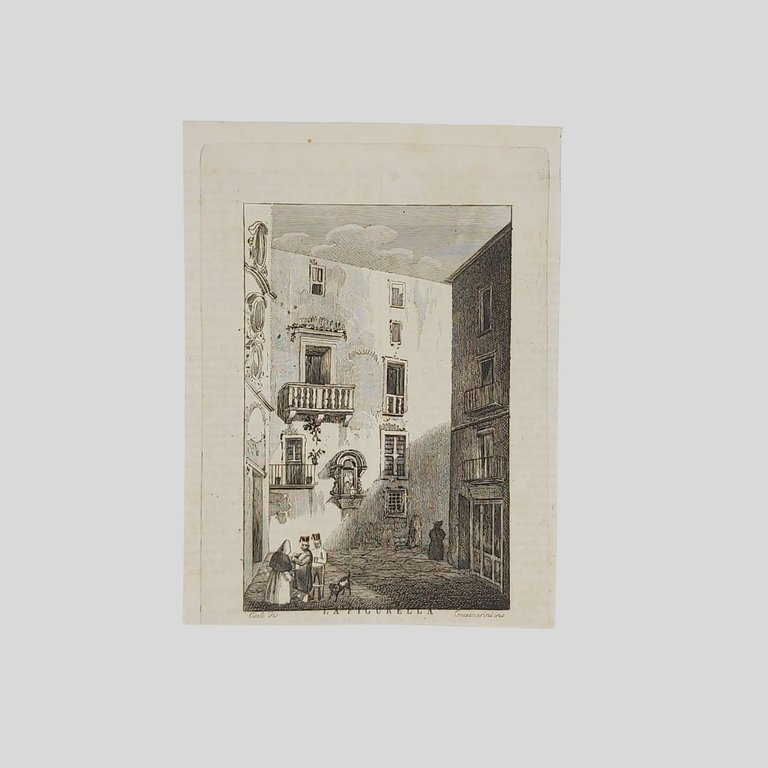 Incisione su rame di Gnaccarini, da un disegno di Ciuli. 1839, mm 190×137 (alla battuta), mm 198×147 (foglio). Didascalia sovrapposta. Lievemente rifilata al margine inferiore, ma in buone condizioni . Tratta da: L’Omnibus Pittoresco Un angolo caratteristico di Napoli con, sullo sfondo, “la figurella” e la silhouette di “padre Rocco”. Non comune. La “figurella” era il nome attribuito alle edicole votive nate per iniziativa di un frate domenicano padre Rocco. Fu sua l’iniziativa di disseminare le vie di Napoli di immagini sacre e di invitare i fedeli ad accendere lumini, illuminando così le strade e scoraggiando i malviventi. «Nel corso dell’anno 1782 morì a Napoli, in età di 82 anni, un monaco domenicano, più popolare, e più celebre pe’ suoi sermoni, di quel che non sono stati in Francia Flechier, Fenelon, Bossuet, ed anche il piccolo Padre Andrea di faceta memoria. Questo monaco si chiamava Padre Rocco. Egli era più potente a Napoli del Sindaco, dell’Arcivescovo, ed anche del Re.» [Alexandre Dumas, I Borboni di Napoli, 1863] Gregorio Maria Rocco (Napoli 1700–1782) è stato un frate domenicano dotato di grande carisma. Nella città di Napoli si prodigò in opere di assistenza e di apostolato per alleviare la sofferenza di poveri ed emarginati e combattere il vizio in tutte le sue forme. Grande la considerazione che gli veniva attribuita presso la corte borbonica: fu lui l’ispiratore in Carlo III di Borbone, della costruzione del Real Albergo dei Poveri (1751-1829) su progetto dell’architetto Ferdinando Fuga, per dare ricovero ai diseredati.Fu sua l’iniziativa dell’illuminazione delle strade napoletane, fino allora inesistente, per contrastare i banditi che sul far del buio assaltavano i viandanti. Essendosi dimostrato vano il tentativo di illuminare le strade con lampade ad olio che venivano subito rimosse dai malintenzionati, era ricorso ad un gesto astuto. Facendo leva sul sentimento religioso popolare, aveva fatto apporre immagini sacre sui muri delle case, sollecitando i fedeli ad accendere a sera un lumino. Particolare zelo dedicò alla gioventù napoletana per sottrarla alla delinquenza e al vizio facendo costruire case di accoglienza e di istruzione.