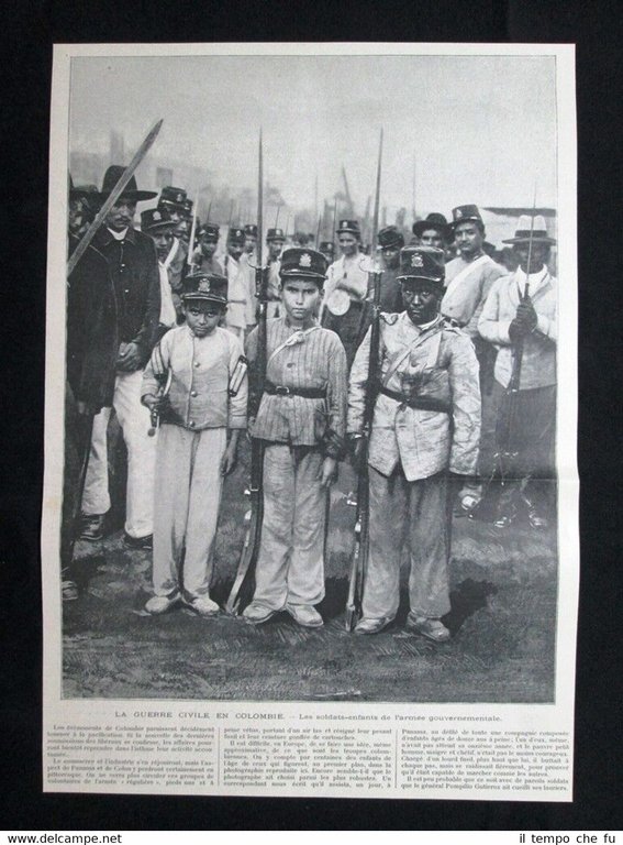 Rara stampa estratta da pubblicazione del 1902. .stampa che ha quindi oltre 116 anni! La guerra civile in Colombia - I bambini soldato dell'esercito governativo Dimensioni Cm 24,00 x 34,00 Illustration 1902 - 13 Qualora vogliate delle scansioni migliori contattateci, soddisferemo ogni vostra richiesta. Paypal Carta di credito Bonifico bancario Accuratamente adagiate su un cartoncino e protette da pellicola trasparente rigida, il tutto viene inserito dentro plico di adeguate dimensioni per proteggerne l'integrità.