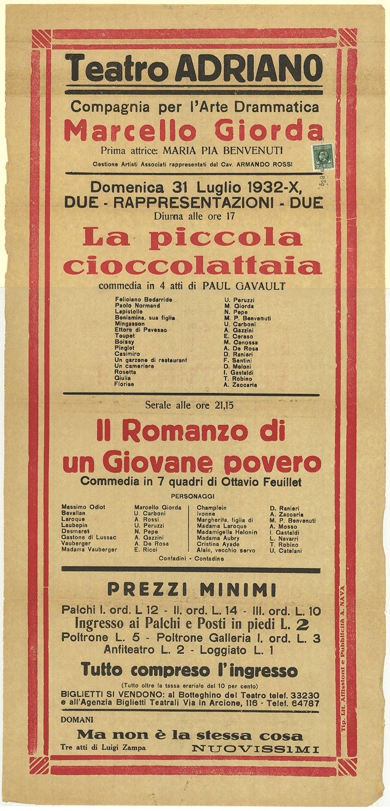 Compagnia per l'Arte Drammatica Marcello Giorda. Prima attrice Maria Pia Benvenuti. Tip. Lit. Nava e C. - Roma. Locandina ripiegata più volte con piccoli strappi. Marca da bollo applicata