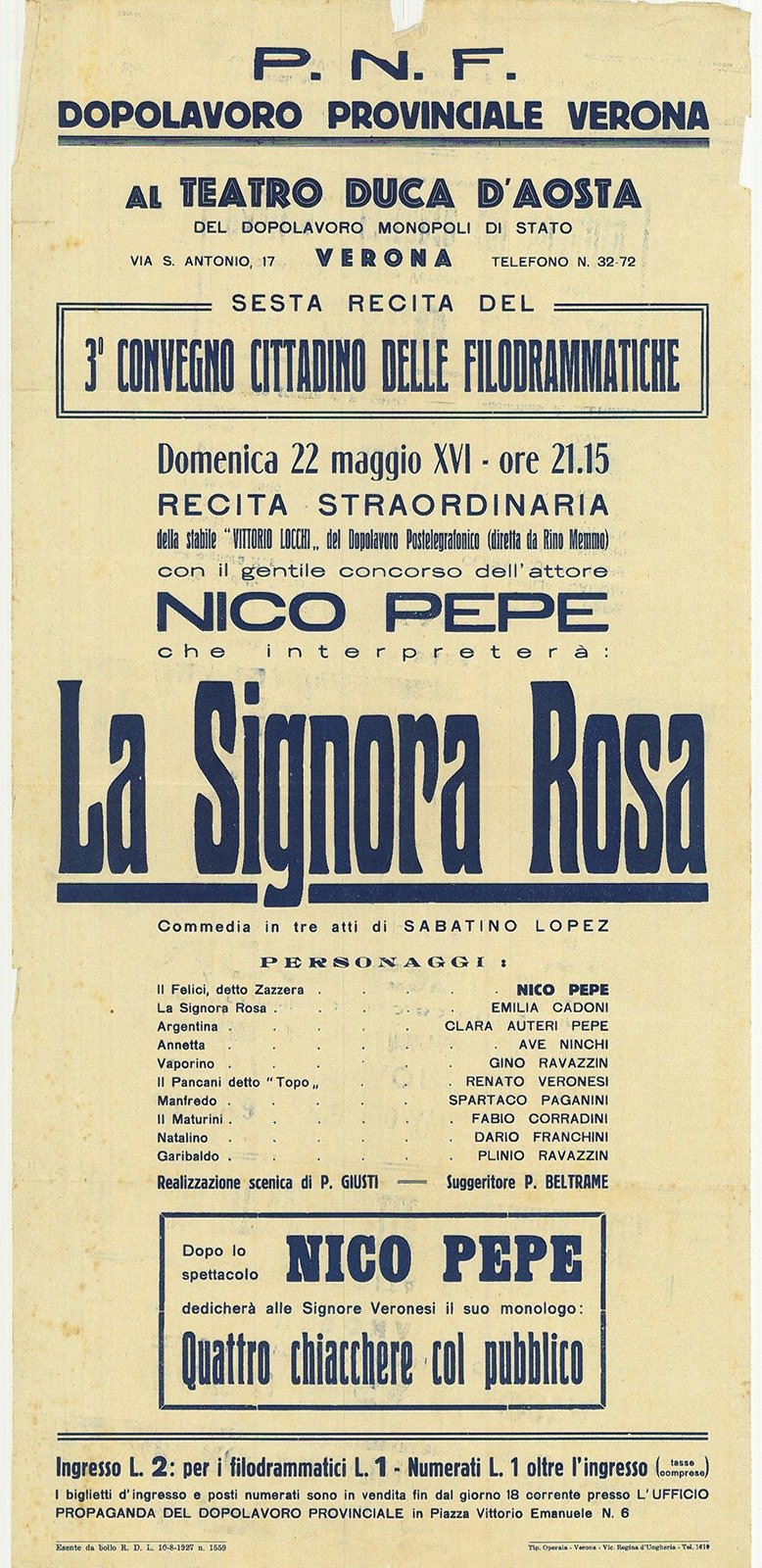 Commedia in tre atti di Sabatino Lopez, con Nico Pepe ed Emilia Cadoni. Terzo Convegno cittadino delle filodrammatiche, P. N. F. Dopolavoro Provinciale Verona, al Teatro Duca d'Aosta, Verona, 22 maggio 1939. Tipografia Operaia - Verona. Locandina ripiegata più volte, usura ai margini con strappi