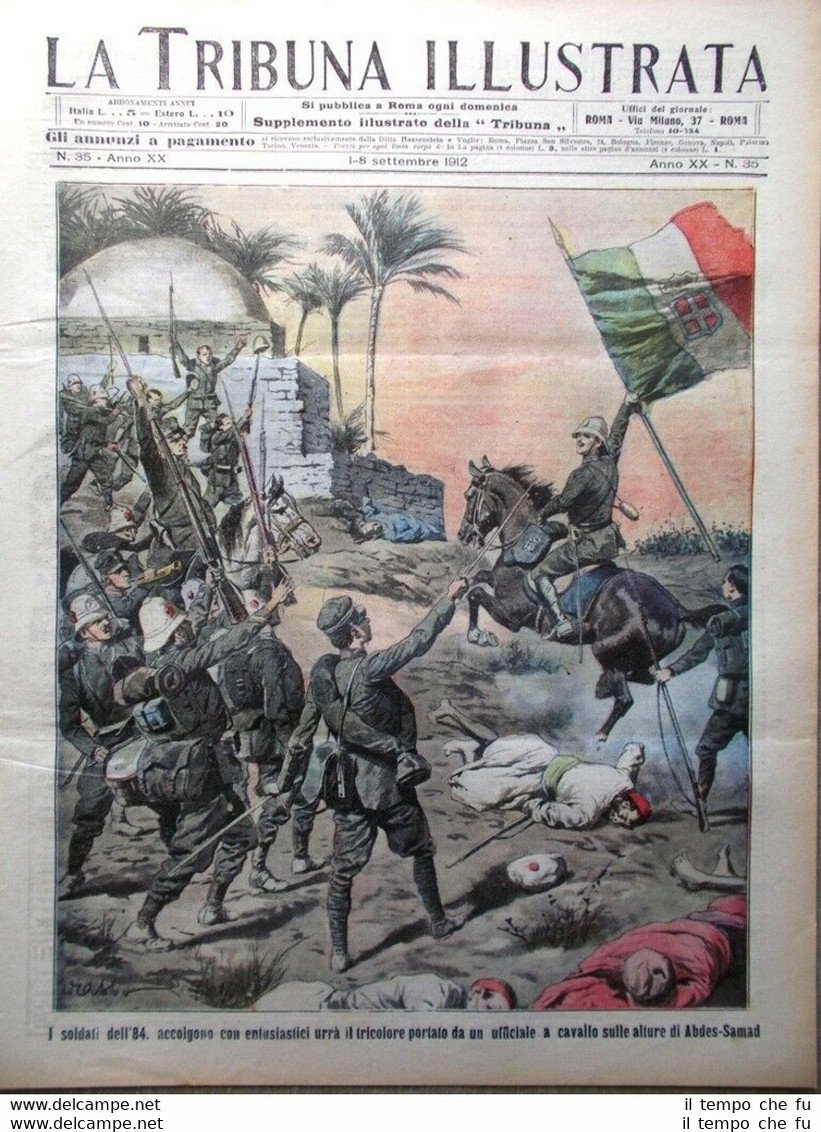 La Tribuna Illustrata Rivista originale del 1-8 Settembre1912 Anno 20 - N. 35 Rarità per appassionati e collezionisti Seguono solo alcuni dei fatti descritti, illustrati e fotografati all'interno Illustrato in copertina (segue foto): I soldati dell'84 accolgono con ensusiastici urrà il tricolore portato da un ufficiale a cavallo sulle alture di Abdes-Samad Illustrato nella retro copertina (segue foto): La soldataglia ottomana, penetrata in un villaggio montenegrino, massacra le donne e ibambini degli insorti Nelle pagine interne: La settimana in Italia e all'estero La fiera di Lipsia. Un villino sistema Gay a Fiuggi. Uomini e luoghi della rivolta albanese. Dopo Regdaline la calma torna in Tripolitania. .e tanto altro ancora! Qualora vogliate maggiori delucidazioni contattateci In questo negozio troverai un'intera categoria dedicata alle Tribune Illustrate, sotto il link diretto alla collezione: Riviste disponibili Cliccaci sopra, troverai di certo ciò che cerchi! La Tribuna Illustrata fu un settimanale italiano pubblicato a Roma. Insieme a La Domenica del Corriere e a L'Illustrazione Italiana fu il settimanale illustrato preferito dagli Italiani nel periodo che intercorse dalla fine dell'800 all'avvento della televisione. Fondato nel 1890 come supplemento del quotidiano La Tribuna, il primo numero uscì il 6 gennaio, il formato della rivista era cm 27 x 38, un formato poco più grande del tabloid. La prima ed ultima pagina erano a colori, disegnate da pittori e incisori affermati. Ogni numero conteneva 16 pagine. I principali collaboratori furono: Luigi Capuana, Adolfo De Bosis, Alfredo Fabrizi, Gandolin, Giuseppe Giacosa, Attilio Luzzato, Enrico Panzacchi, Rastignac, Attilio Sarfatti, Armand Silvestre, Ettore Socci, Gaspare Ungarelli, Pio Vanzi, Annie Vivanti. Il Corredo iconografico fu di prim'ordine. I principali pittori, disegnatori ed illustratori furono: Basilio Cascella e i figli Tommaso e Michele, Enrico Lionne, Aleardo Terzi, Augusto Bompiani, Roberto Bompiani, Domenico Bruschi, Modesto Faustini, Rubens Santoro, Rafael Senet, Cesare Tiratelli. Tra i romanzi a puntate che vi uscirono ricordiamo: L'invincibile, di Gabriele D'Annunzio Una giovinezza, di Francois Coppée e Zia Aurelia di André Theuriet, questi ultimi due entrambi illustrati da Emile Bayard. Paypal Carta di credito Bonifico bancario Spedizione con posta prioritaria o raccomandata scelta dall'acquirente nel momento del pagamento
