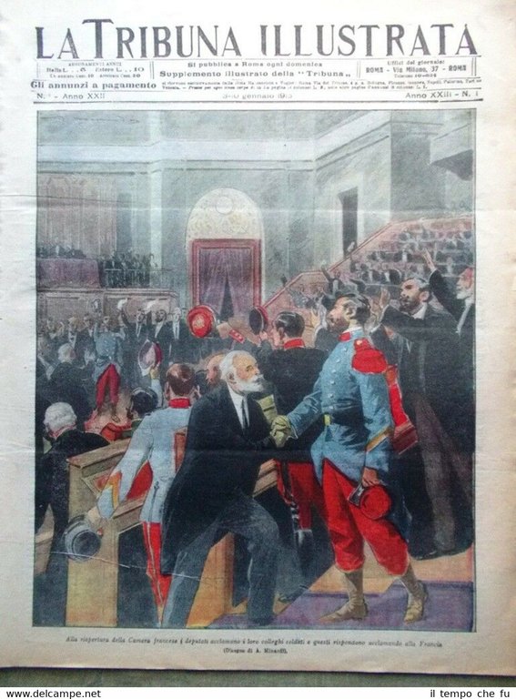 La Tribuna Illustrata Rivista originale del 3-10 Gennaio 1915 Anno 23 - N. 1 Rarità per appassionati e collezionisti Seguono solo alcuni dei fatti descritti, illustrati e fotografati all'interno Illustrato in copertina (segue foto): Alla riapertura della Camera francese i deputati acclamano i loro colleghi soldati e questi rispondono acclamando alla Francia Illustrato nella retro copertina (segue foto): Dalle conquistate trincee di Fiandra, da quei campi nevosi avvolti da una grigia atmosfera di morte i combattenti inglesi brindano all'anno che sorge Nelle pagine interne: Le milizie canadesi in Francia. L'imperatrice di Germania visita un treno-ospedale. I grandi mortai austriaci che l'artiglieria tedesca adopera per bombardare Namur e Maubeuge. Scene di guerra (fotografie). Il Natale del 1914 sui campi e sui mari di battaglia Il più recente ritratto del Principe di Piemonte. L'industria della carta pesta a Lecce. .e tanto altro ancora! Qualora vogliate maggiori delucidazioni contattateci In questo negozio troverai un'intera categoria dedicata alle Tribune Illustrate, sotto il link diretto alla collezione: Riviste disponibili Cliccaci sopra, troverai di certo ciò che cerchi! La Tribuna Illustrata fu un settimanale italiano pubblicato a Roma. Insieme a La Domenica del Corriere e a L'Illustrazione Italiana fu il settimanale illustrato preferito dagli Italiani nel periodo che intercorse dalla fine dell'800 all'avvento della televisione. Fondato nel 1890 come supplemento del quotidiano La Tribuna, il primo numero uscì il 6 gennaio, il formato della rivista era cm 27 x 38, un formato poco più grande del tabloid. La prima ed ultima pagina erano a colori, disegnate da pittori e incisori affermati. Ogni numero conteneva 16 pagine. I principali collaboratori furono: Luigi Capuana, Adolfo De Bosis, Alfredo Fabrizi, Gandolin, Giuseppe Giacosa, Attilio Luzzato, Enrico Panzacchi, Rastignac, Attilio Sarfatti, Armand Silvestre, Ettore Socci, Gaspare Ungarelli, Pio Vanzi, Annie Vivanti. Il Corredo iconografico fu di prim'ordine. I principali pittori, disegnatori ed illustratori furono: Basilio Cascella e i figli Tommaso e Michele, Enrico Lionne, Aleardo Terzi, Augusto Bompiani, Roberto Bompiani, Domenico Bruschi, Modesto Faustini, Rubens Santoro, Rafael Senet, Cesare Tiratelli. Tra i romanzi a puntate che vi uscirono ricordiamo: L'invincibile, di Gabriele D'Annunzio Una giovinezza, di Francois Coppée e Zia Aurelia di André Theuriet, questi ultimi due entrambi illustrati da Emile Bayard. Paypal Carta di credito Bonifico bancario Spedizione con posta ordinaria o raccomandata scelta dall'acquirente nel momento del pagamento