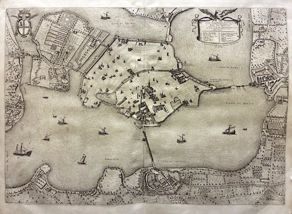 Incisione originale su rame (cm. 61x43 più ampi margini bianchi) tratta dalla monumentale opera ‘Nouveau Theatre de l’Italie’, riedizione del ‘Theatrum Civitatum’ pubblicato da Joan Blaeu nel 1663. Nel cartiglio in alto a destra una legenda con rimandi a 17 luoghi notabili della città. Esemplare in nitida impressione ed eccellente stato di conservazione. Nel 1672 la tipografia di Blaeu fu distrutta da un incendio e l’editore Mortier rilevò ciò che restava delle lastre di rame (alcune delle quali ancora inedite), aggiunse nuove tavole e ritoccò - seppur con piccole modifiche - buona parte delle vedute originarie.