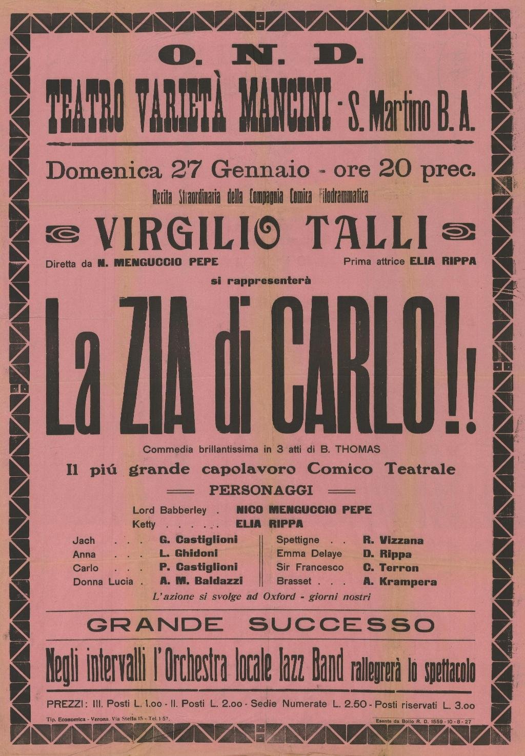 Commedia in tre atti di B. Thomas, Compagnia Comica Filodrammatica Virgilio Talli, con Nico Pepe. Teatro Varietà Mancini - S. Martino B. A. Tipografia Economica - Verona. Manifesto ripiegao più volte, annotazione al retro, leggermente sbiadito nelle pieghe, leggera usura ai margini , sgualcito
