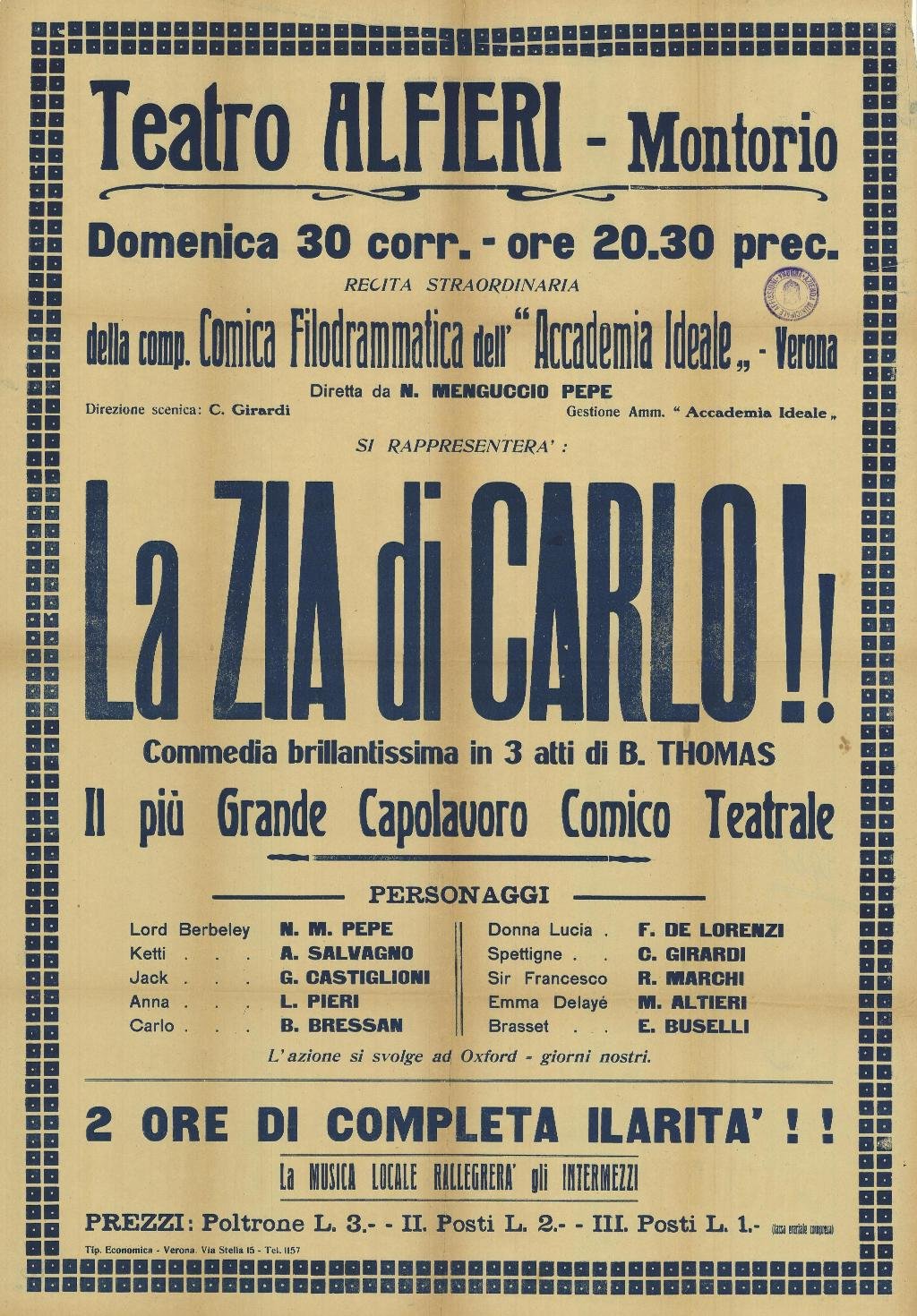 Commedia in tre atti di B. Thomas, Compagnia Comica Filodrammatica Accademia Ideale, con Nico Pepe, Teatro Alfieri - Montorio. Tipografia Economica - Verona. Manifesto ripiegato più volte, timbro, pieghe ingiallite, annotazioni al retro a matita blu
