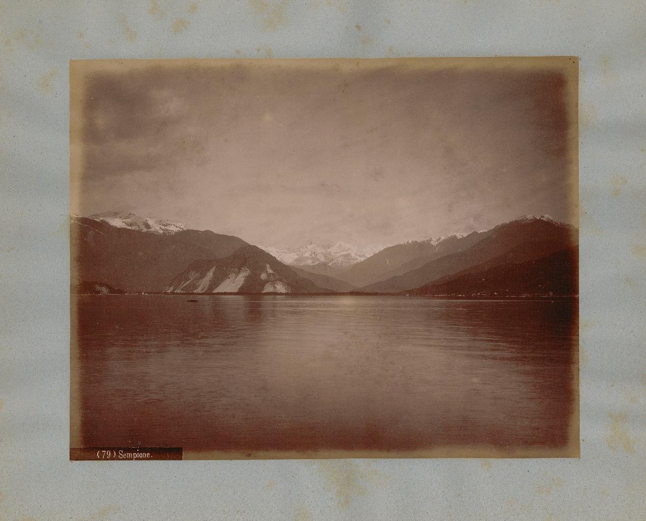 Fotografia all'albumina, antica ed originale, che riprende il tratto della sponda di Fondo Toce sul Lago Maggiore con le montagne della Valdossola sulla strada del Sempione. La foto, di autore anonimo, databile 1880 ca, di mm 195x250 è applicata editorialmente su cartoncino coevo di mm 280x300. In basso a sinistra il titolo "(79) Sempione"