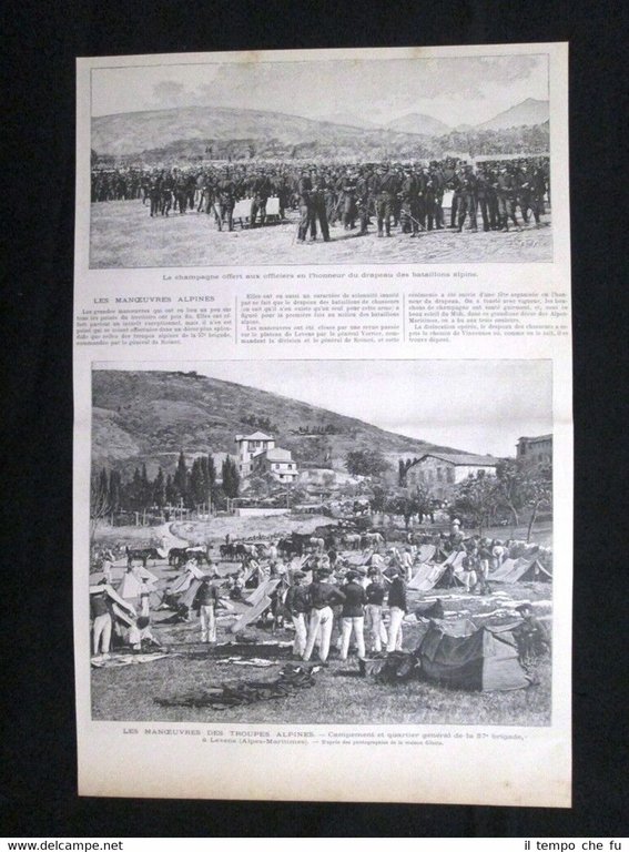 Rara incisione estratta da pubblicazione del 1894 .stampa che ha quindi oltre 124 anni! Le manovre delle Truppe Alpine Lo champagne offerto agli ufficiali in onore della bandiera dei battaglioni alpini Campo e quartier generale della 57 brigata, a Levens (Alpi Marittime) Dimensioni Cm 23,00 x 36,00 Illustration 1894 - 035 Qualora vogliate delle scansioni migliori contattateci, soddisferemo ogni vostra richiesta. Paypal Carta di credito Bonifico bancario Accuratamente adagiate su un cartoncino e protette da pellicola trasparente rigida, il tutto viene inserito dentro plico di adeguate dimensioni per proteggerne l'integrità.