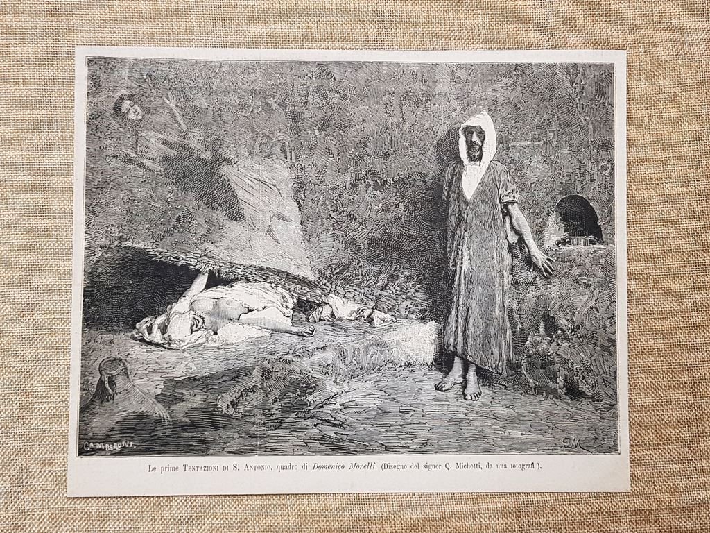 Le prime tentazioni di Sant'Antonio Quadro di Domenico Morelli Stampa del 1881 Rara stampa estratta da pubblicazione del 1881 Le prime tentazioni di Sant'Antonio Quadro di Domenico Morelli Codice prodotto: II1881-037 Dimensioni: Cm 22,00 x 18,00