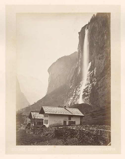 Fotografia originale con raffigurazione della località, con l'alta cascata. In color seppia, applicata su cartoncino coevo rigido