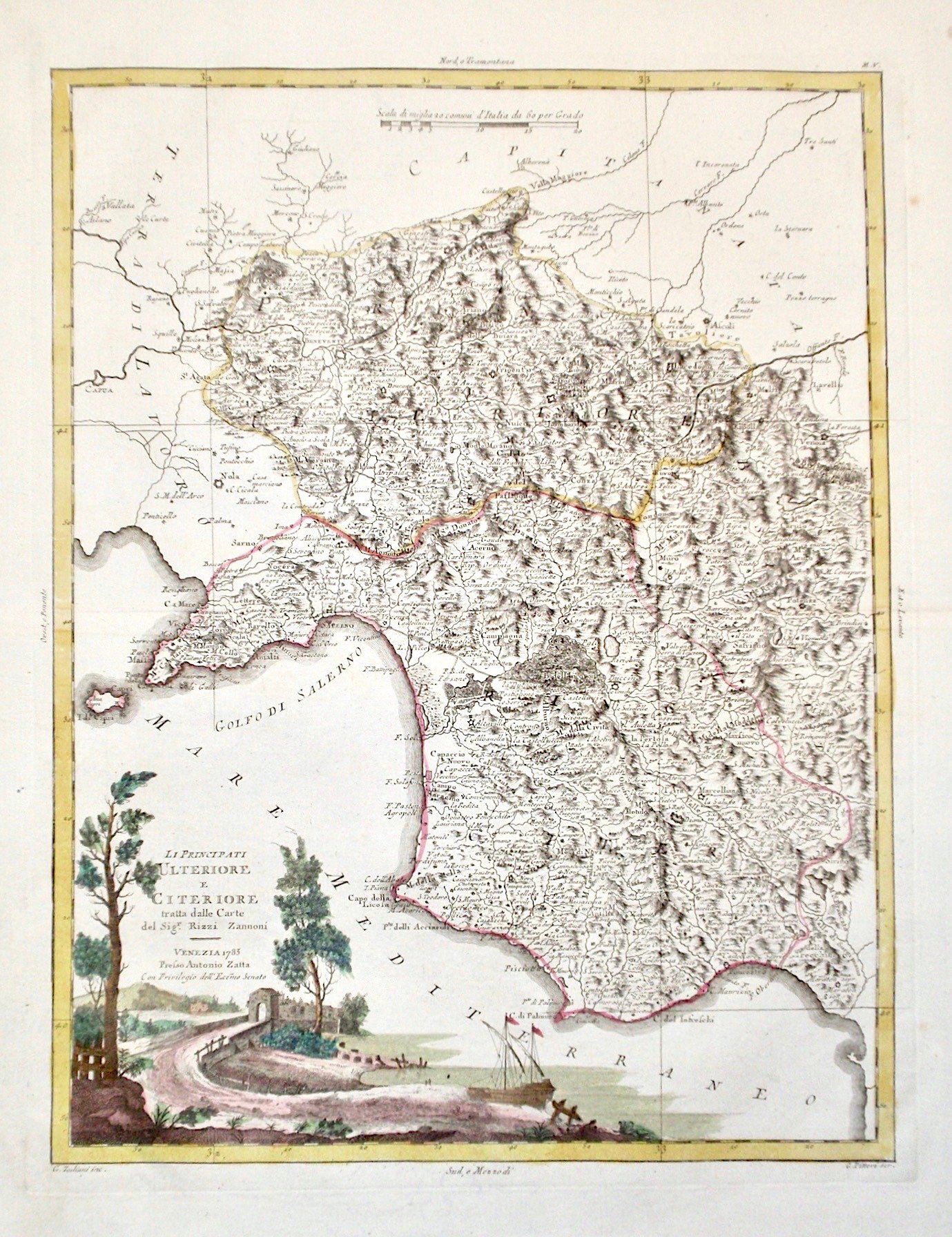 Incisione in rame di mm 305x405, colorata d'epoca ai confini. In basso a sinistra bel cartiglio figurato e dipinto. Antonio Zatta (1775-1797) è stato uno dei più importanti editori di carte geografiche del trardo XVIII secolo italiano. La sua opera costituisce un importante punto di passaggio tra la cartografia antica e moderna, più attenta all'accuratezza dei dettagli geografici che all'abbellimento estetico ricco di motivi mitologici o d'invenzione, come era quello dell'epoca precedente. La sua opera più importante è Atlante novissimo pubblicato tra il 1775 e il 1789. Ottimo stato di conservazione.<BR>