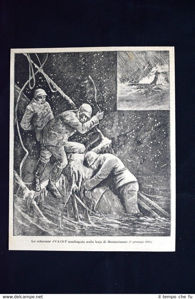 Rara incisione estratta da pubblicazione del 1886. .incisione che ha quindi oltre 131 anni! Lo schooner Juliet naufragato nella baia di Massachussetts (9 gennaio 1886) Dimensioni Cm 18,00 x 22,00 EP1886 - 003.1 Qualora vogliate delle scansioni migliori contattateci, soddisferemo ogni vostra richiesta. Paypal Carta di credito Bonifico bancario Accuratamente adagiate su un cartoncino e protette da pellicola trasparente rigida, il tutto viene inserito dentro plico di adeguate dimensioni per proteggerne l'integrità.