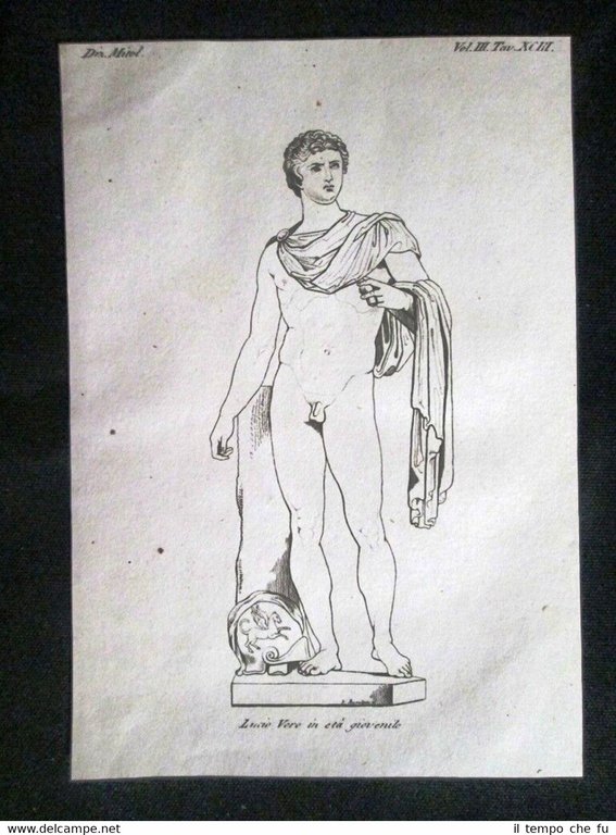 Incisione stampata su carta pesante non retroscritta Estratta da ricercata pubblicazione del 1819 - 1827 . .rara incisione all'acquaforte su rame che ha quindi circa 200 anni! L'imperatore di Roma Lucio Vero, in età giovanile Dimensioni Cm 13,00 x 19,00 DoM - 015 Estratta dalla rarissima opera "Dizionario d'ogni mitologia e antichità Incominciato da Girolamo Pozzoli sulle tracce del Dizionario della favola di Fr. Noel continuato e ampliato dal Prof. Felice Romani e dal Dr. Antonio Peracchi" Monumentale lavoro di erudizione e studio dei miti che riprende il Dictionnaire de la Fable (Paris 1801) volgarizzandolo e ampliandolo nella trattazione della mitologia greca, latina, egizia, celtica, persiana, siriaca, indiana, cinese, maomettana, rabbinica, slava, scandinava, africana, americana, araba, iconologica, cabalistica, ecc. Autore: Pozzoli Girolamo Pubblicato da Batelli e Fanfani in Milano tra il 1819 - 1827 Prima edizione italiana Qualora vogliate delle scansioni migliori contattateci, soddisferemo ogni vostra richiesta. Paypal Carta di credito Bonifico bancario Accuratamente adagiate su un cartoncino e protette da pellicola trasparente rigida, il tutto viene inserito dentro plico di adeguate dimensioni per proteggerne l'integrità.
