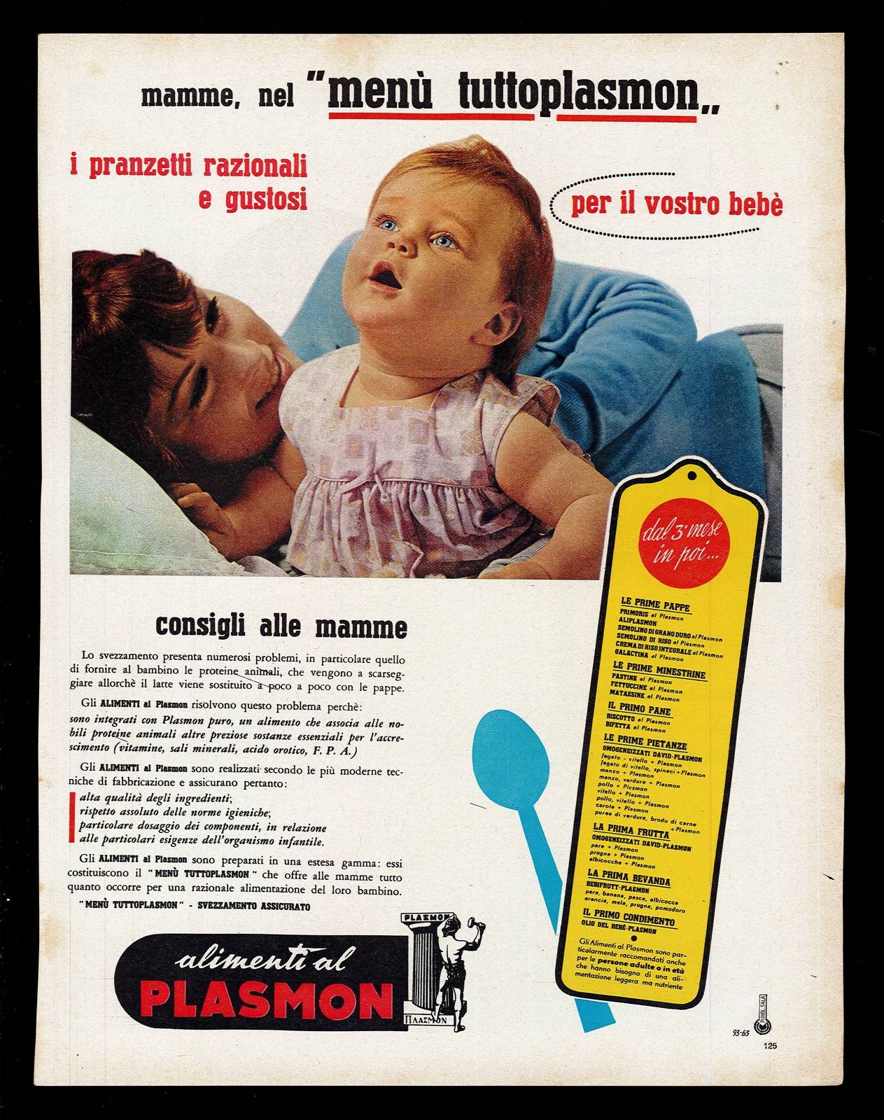 Autore: n.d. Luogo: n.d. Anno: [1960]. Tecnica: offset. Dimensioni: 32x25. Conservazione: buone. Foglio sciolto tratto da periodico anni '60, pagina pubblicitaria Plasmon
