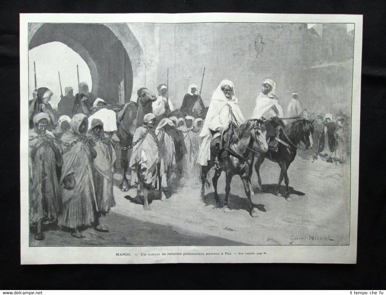 Rara stampa estratta da pubblicazione del 1903 .stampa che ha quindi oltre 115 anni! Marocco - Un convoglio di prigionieri ribelli entrano a Fez Dimensioni Cm 34,00 x 25,00 Illustration 1903 - 010 Qualora vogliate delle scansioni migliori contattateci, soddisferemo ogni vostra richiesta. Paypal Carta di credito Bonifico bancario Accuratamente adagiate su un cartoncino e protette da pellicola trasparente rigida, il tutto viene inserito dentro plico di adeguate dimensioni per proteggerne l'integrità.