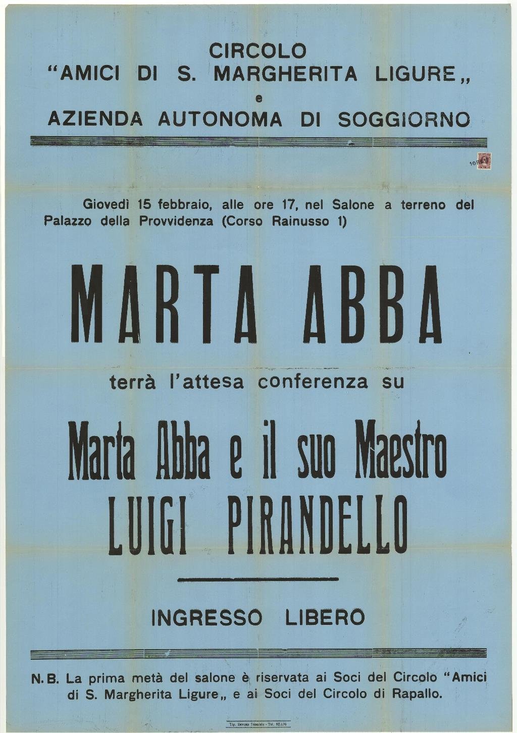 Conferenza di Marta Abba su Pirandello a Santa Margherita Ligure, organizzata da Circolo Amici di S. Margherita Ligure e l'Azienda Autonoma di Soggiorno. Marca da bollo e timbro, Tipografia Devoto Dioniso, esemplare ripiegato più volte con ingiallimento e piccole lacerazioni alle pieghe