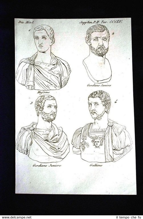 Incisione stampata su carta pesante non retroscritta Estratta da ricercata pubblicazione del 1819 - 1827. .rara incisione all'acquaforte su rame che ha quindi circa 200 anni! Massimo - Gordiano Seniore - Gordiano Juniore - Gallieno Antichità romana Dimensioni Cm 13,00 x 20,00 DoM - 002 Estratta dalla rarissima opera "Dizionario d'ogni mitologia e antichità Incominciato da Girolamo Pozzoli sulle tracce del Dizionario della favola di Fr. Noel continuato ed ampliato dal Prof. Felice Romani e dal Dr. Antonio Peracchi" Monumentale lavoro di erudizione e studio dei miti che riprende il Dictionnaire de la Fable (Paris 1801) volgarizzandolo e ampliandolo nella trattazione della mitologia greca, latina, egizia, celtica, persiana, siriaca, indiana, cinese, maomettana, rabbinica, slava, scandinava, africana, americana, araba, iconologica, cabalistica, ecc. Autore: Pozzoli Girolamo Pubblicato da Batelli e Fanfani in Milano tra il 1819 - 1827 Prima edizione italiana Qualora vogliate delle scansioni migliori contattateci, soddisferemo ogni vostra richiesta. Paypal Carta di credito Bonifico bancario Accuratamente adagiate su un cartoncino e protette da pellicola trasparente rigida,il tutto viene inserito dentro plico di adeguate dimensioni per proteggerne l'integrità
