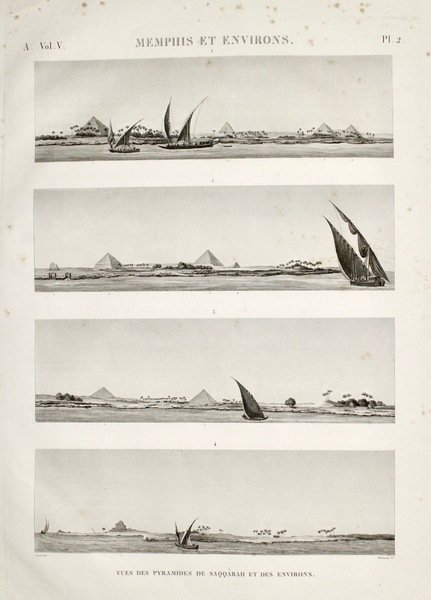 Incisione in rame di mm 590x420, ad opera di Delaunay su disegno di Cecile, raffigurante quattro vedute delle piramidi viste dal Nilo. Dominique Vivant, barone Denon (1747-1825) è stato uno scrittore, incisore ed egittologo francese. Prese parte alla spedizione di Napoleone in Egitto da cui derivò l'opera Description de l'Egypte ou recueil des observations faites en Egypte pendant l'expédition française, publié par les ordres de Sa Majesté l'Empereur Napoléon le Grand, da cui questa tavola proviene. Per il granze zelo e ingegno con cui amministrò il Musée Napoléon del Louvre è considerato uno dei precursori della museologia moderna. Buon esemplare, con minime e leggere fioriture ai margini.