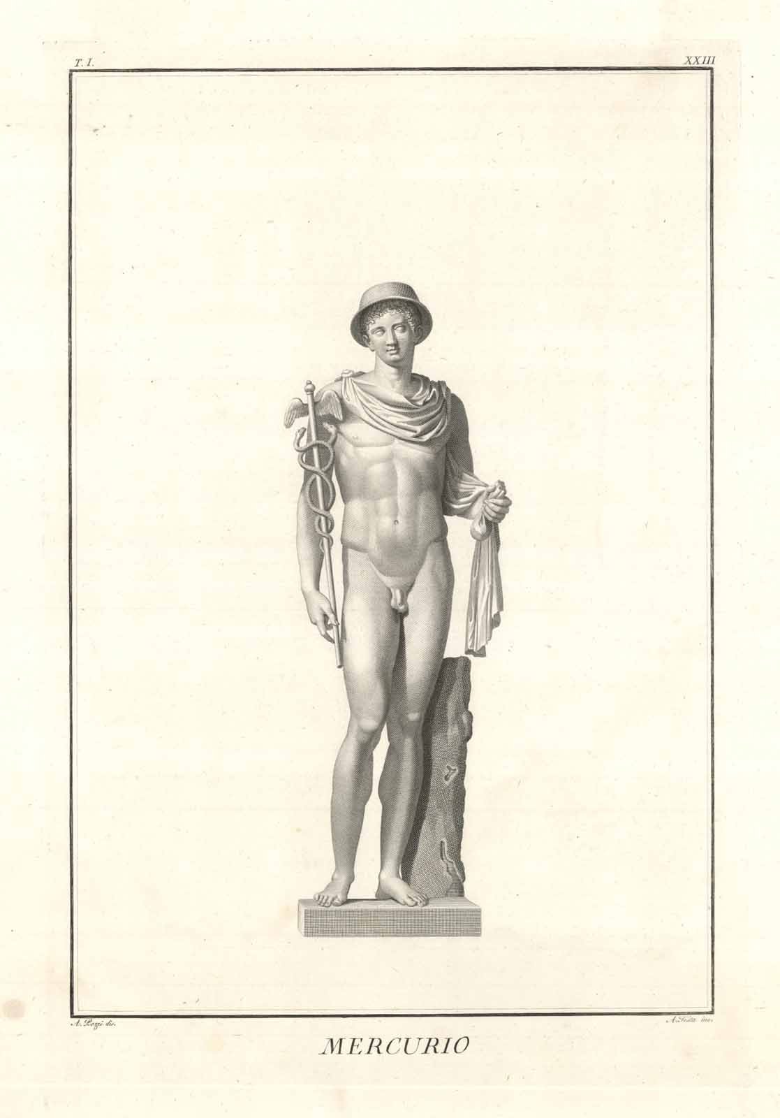 Incisione raffigurante Mercurio inserita nel tomo primo dell'opera "Il Museo Chiaramonti aggiunto al Pio-Clementino da N. S. Pio VII P. N." Pubblicata da Antonio d'Este e Gaspare Capparone a Roma nel 1808. Il dio protettore del commercio, dell'atletica, dei viaggiatori, della farmacia, indossa leggiadro un semplice mantello, clamide, e in mano tiene il caduceo, simbolo di prosperità e di pace, l'emblema universale della scienza medica. Autore: Pozzi A. dis. & Testa A. inc. Luogo: Mercurio. Anno: 1808. Tecnica: incisione in rame. Dimensioni: 620x430 il foglio.