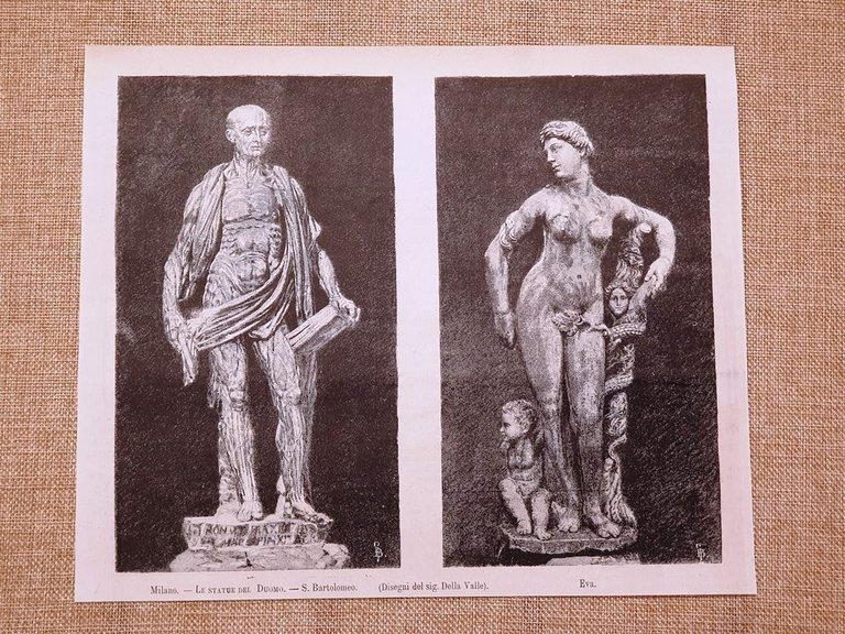 Milano nel 1881 Statue del Duomo San Bartolomeo ed Eva Disegno di Della Valle Rara stampa estratta da pubblicazione del 1881 Milano nel 1881 Statue del Duomo San Bartolomeo ed Eva Disegno di Della Valle Codice prodotto: II1881-035 Dimensioni: Cm 22,00 x 18,00