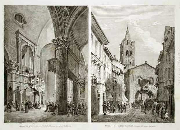Insieme di due vignette raffiguranti l'interno del Duomo e il Palazzo Comunale. Testo al verso