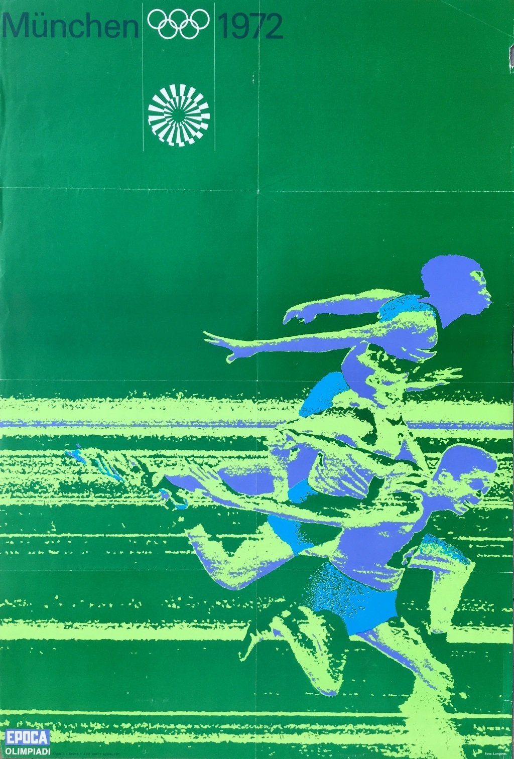 Manifesto originale ufficiale delle Olimpiadi di Monaco di Baviera del 1972, allegato a Epoca nr 1141 dellì 11 agosto 1972. Pieghe editoriali. Pieghe mancanza lungo il margine dx.