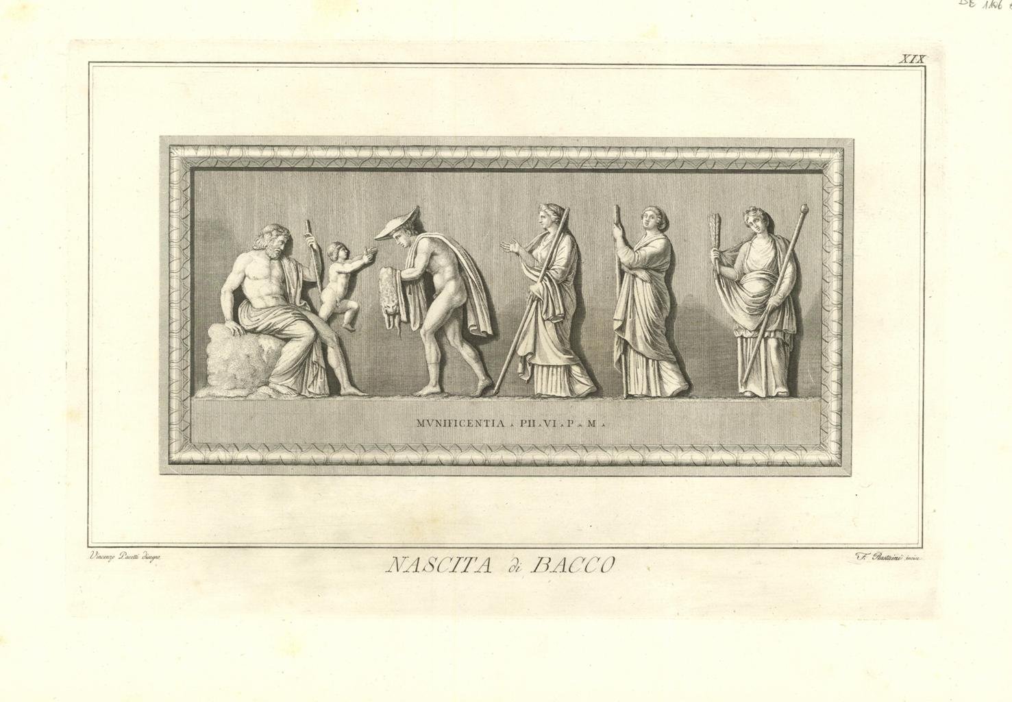 Rappresentazione della nascita di Bacco dal femore di Giove. Giove si innamorò di Samele, figlia del re di Tebe, benché sposato con Era. Dalla relazione fu concepito un figlio, ma Era non avrebbe permesso che venisse al mondo. Giove, allora, decise di cucire nella sua coscia l’embrione, per farlo uscire completamente formato. Qui Bacco, appena nato, viene consegnato nelle braccia di Mercurio per mano di Giove, segue la dea Lucina, dea del puerperio, Proserpina o Libera, e Cerere dea della nascita. Inserita nell'opera "Il Museo Pio-Clementino descritto da Ennio Quirino Visconti Presidente del Museo Capitolino - Tomo quarto - Dedicato alla Santità di Nostro Signore PIO SESTO Pontefice Massimo. Edito da Luigi e Giuseppe Mirri / Mercante di quadri incontro il Palazzo Bernini. In Roma MDCCLXXXIV con Privilegio Pontificio