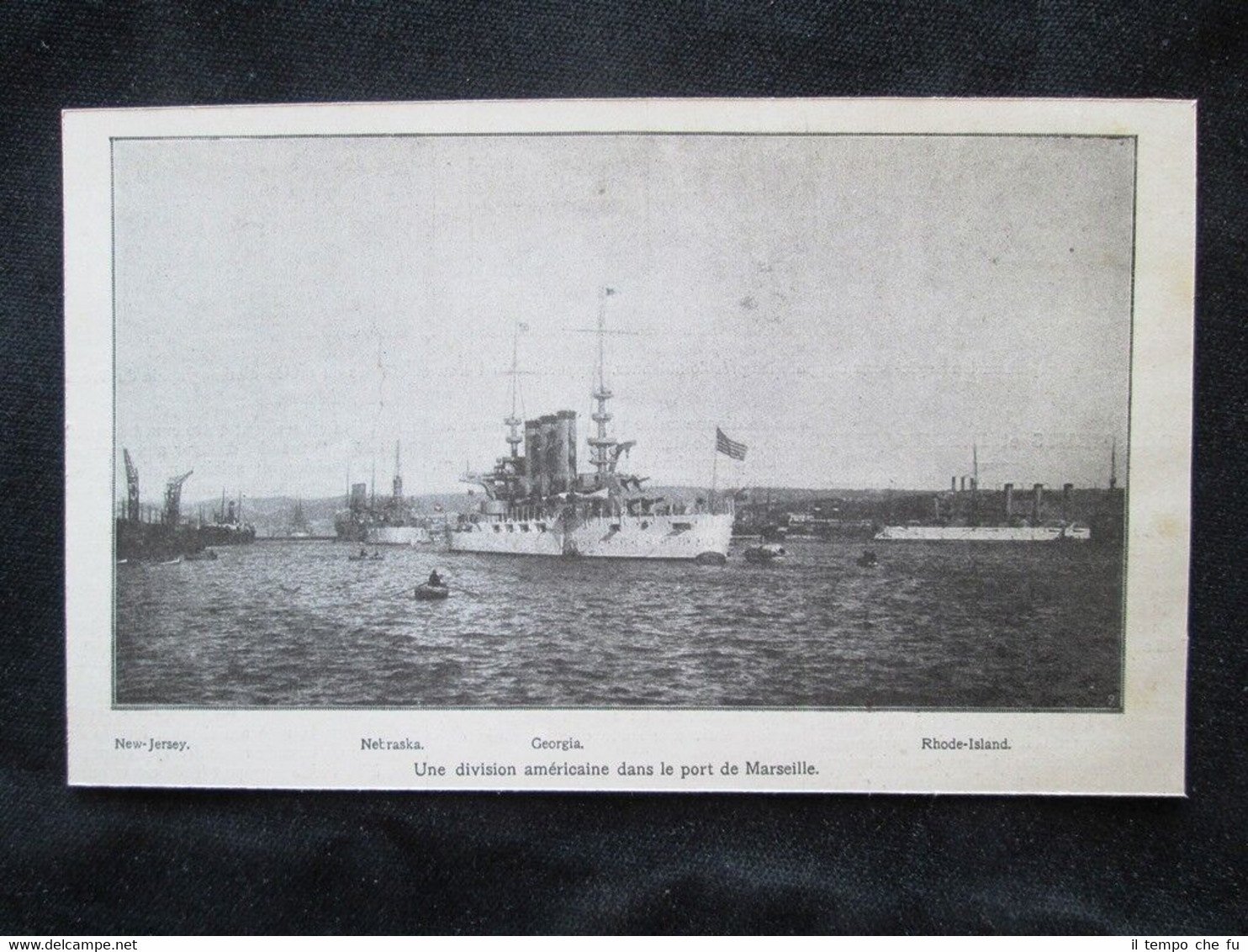 Rara stampa estratta da pubblicazione del 1909 .stampa che ha quindi oltre 109 anni! Divisione americana nel porto di Marsiglia New Jersey - Nebraska - Georgia - Rhode Island Dimensioni Cm 18,00 x 11,00 Illustration 1909 - 010 Qualora vogliate delle scansioni migliori contattateci, soddisferemo ogni vostra richiesta. Paypal Carta di credito Bonifico bancario Accuratamente adagiate su un cartoncino e protette da pellicola trasparente rigida, il tutto viene inserito dentro plico di adeguate dimensioni per proteggerne l'integrità.