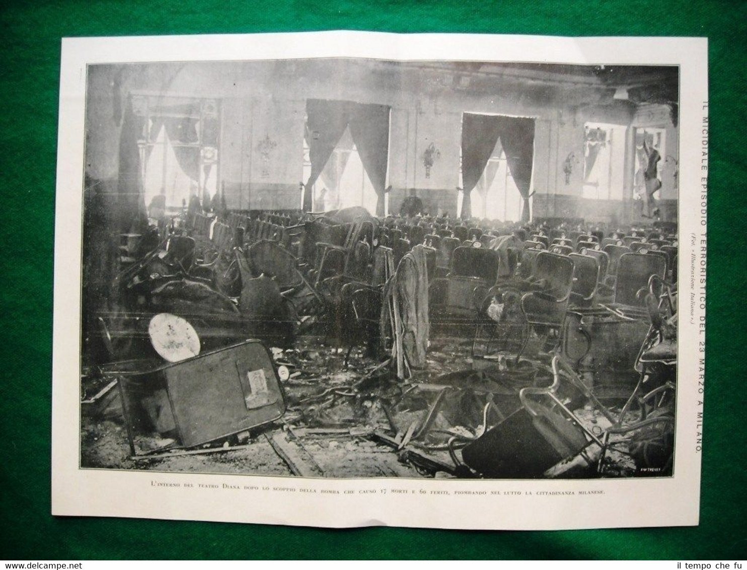 Rara Stampa Estratta da Rivista d'epoca del 1921 Nel 1921 Il micidiale episodio terroristico del 23 Marzo a Milano. L'interno del Teatro Diana dopo lo scoppio della bomba che causò 17 morti e 60 feriti, piombando nel lutto la cittadinanza milanese + La porta di soccorso del Teatro Diana, in via Mascagni, ove venne collocato l'ordigno micidiale. Le saracinesche divelte e contorte dall'esplosione. Com'è ridotto il vano dell'orchestra del Teatro Diana, ove più numerose furono le vittime II1921-06 Dimensioni Cm 35,00 x 26,00 + 26,00 x 35,00 Qualora vogliate delle scansioni migliori contattateci, soddisferemo ogni vostra richiesta. PaypalCarta di creditoBonifico bancario Accuratamente adagiate su un cartoncino e protette da pellicola trasparente rigida,il tutto viene inserito dentro plico di adeguate dimensioni per proteggerne l'integrità.