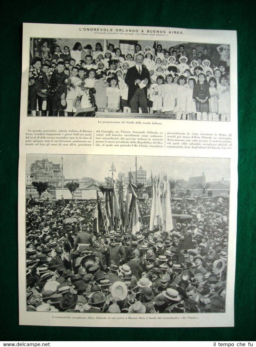 Rara Stampa Estratta da Rivista d'epoca del 1921 Nel 1921 L'on. Orlando a Buenos Aires. La presentazione dei bimbi delle scuole italiane L'entusiastiche accoglienze all'on. Orlando al suo arrivo a Buenos Aires a bordo del transatlantico "Re Vittorio" + Dopo il banchetto al Ministero degli Esteri: l'on. Belfor del Valle, il dott. Cantillo, l'on. Orlando e il ministro d'Italia L'on. Orlando tra i bimbi delle scuole italiane la signorina Orlando parte per un volo. II1921-07 Dimensioni Cm 25,00 x 35,00 + 25,00 x 35,00 Qualora vogliate delle scansioni migliori contattateci, soddisferemo ogni vostra richiesta. PaypalCarta di creditoBonifico bancario Accuratamente adagiate su un cartoncino e protette da pellicola trasparente rigida,il tutto viene inserito dentro plico di adeguate dimensioni per proteggerne l'integrità.
