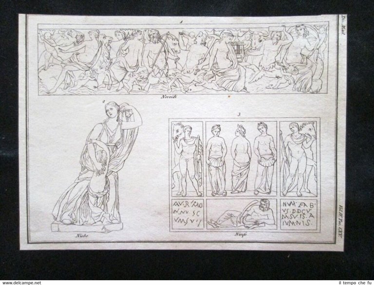 Incisione stampata su carta pesante non retroscritta Estratta da ricercata pubblicazione del 1819 - 1827 . .rara incisione all'acquaforte su rame che ha quindi circa 200 anni! 1. Nereidi 2. Niobe 3. Ninfe Dimensioni Cm 19,00 x 13,00 DoM - 020 Estratta dalla rarissima opera "Dizionario d'ogni mitologia e antichità Incominciato da Girolamo Pozzoli sulle tracce del Dizionario della favola di Fr. Noel continuato e ampliato dal Prof. Felice Romani e dal Dr. Antonio Peracchi" Monumentale lavoro di erudizione e studio dei miti che riprende il Dictionnaire de la Fable (Paris 1801) volgarizzandolo e ampliandolo nella trattazione della mitologia greca, latina, egizia, celtica, persiana, siriaca, indiana, cinese, maomettana, rabbinica, slava, scandinava, africana, americana, araba, iconologica, cabalistica, ecc. Autore: Pozzoli Girolamo Pubblicato da Batelli e Fanfani in Milano tra il 1819 - 1827 Prima edizione italiana Qualora vogliate delle scansioni migliori contattateci, soddisferemo ogni vostra richiesta. Paypal Carta di credito Bonifico bancario Accuratamente adagiate su un cartoncino e protette da pellicola trasparente rigida, il tutto viene inserito dentro plico di adeguate dimensioni per proteggerne l'integrità.